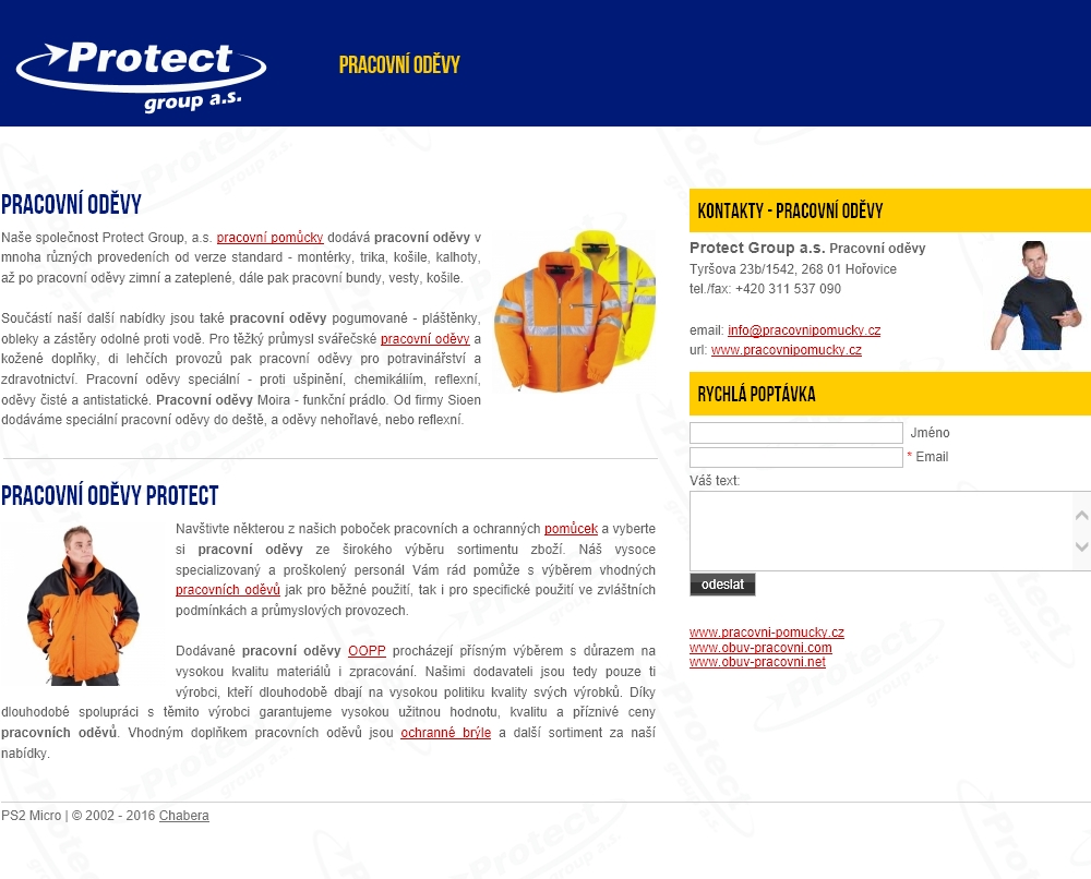 Pracovní a ochranné oděvy, samostatné stránky s vybraným sortimentem naší katalogové nabídky.