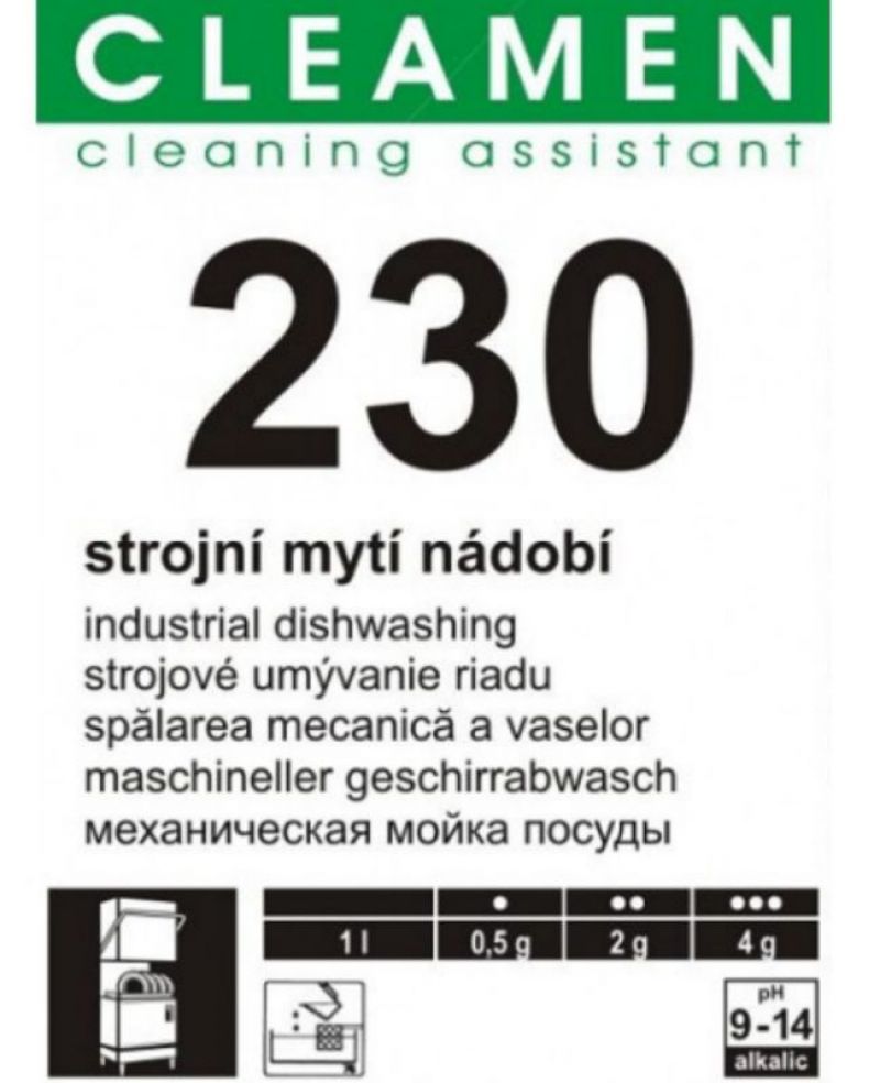 Tekutý, bezfosfátový, vysoce koncentrovaný, mycí prostředek, určený pro všechny typy profesionálních myček nádobí a skla. Výrobek je nutné používat vždy v kombinaci s Cleamenem 231 strojní oplach nádobí.