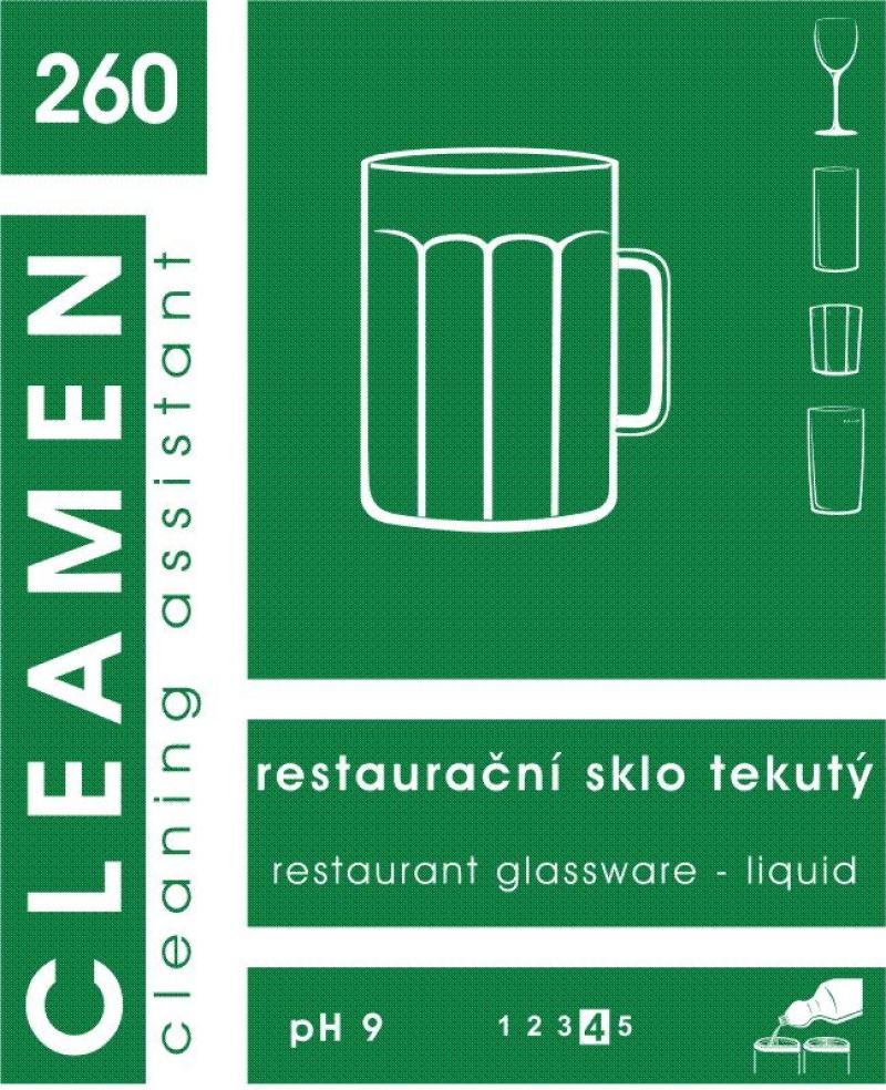 Koncentrovaný prostředek, určený k ředění, pro mytí pivního a restrauračního skla. Vhodný i do myček. Po umytí pivních sklenic přípravkem CLEAMEN 260 restaurační sklo, zůstává na pivu déle pěna a pivo si udrží říz. Obrovskou výhodou je neutrální pH, které zajišťuje dermální toleranci při ruční práci v roztoku. Navíc díky receptuře která neobsahuje agresivní odmašťovadla, nepoškozuje sklo při dlouhodobém strojním mytí. Vhodný i pro mytí jakýchkoliv pevných ploch oplachovou metodou. Doporučujeme na mytí křišťálových lamp a lustrů.