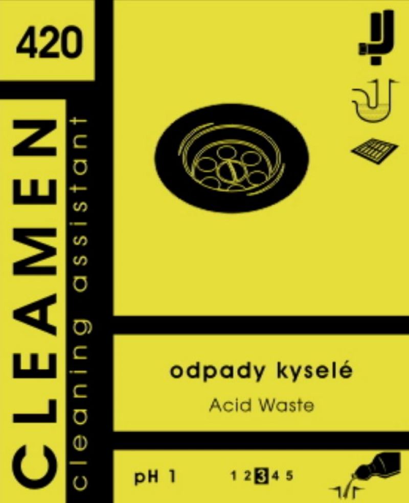 Koncentrovaný prostředek určený k přímému použití k pročištění plastových a keramických odpadů, umývadel, sprch, WC, kanalizace apod., ucpaných tuky, mýdlem, vápenitými usazeninami, vlasy, papírem, vložkami, hadrem. Pozor! Žíravina! Obsahuje kyselinu sírovou. Vyloučit styk s kůží a vniknutí do očí. Do přídavku nikdy nepřilévat vodu, nebezpečí vystříknutí a poleptání. Ukládat mimo dosah dětí. Neředit! Nachází-li se místo ucpání (blok odtoku) odpadu mezi výlevkou a sifonem, je nutné nejdříve tento blok mechanicky odstranit a teprve po té použít Cleamen 420 odpady kyselé. V případě nedodržení přesného postupu (pomalu a postupně vlévat určenou dávku pouze do odpadu), možnost vybublání směsi kyseliny a vody, která pak může poškodit okolí vtoku, obzvláště barevné plasty a smalty! NEPOLÍT OKOLÍ ODPADU! Je nutné aby odpadní potrubí mělo dostatečný odtokový spád, tak aby přípravek nezůstával v potrubí, kde by mohl při dlouhodobějším působení rozleptávat lepidla ve spojích. Přípravek aplikujte přímo z láhve do výlevky (do odpadu).