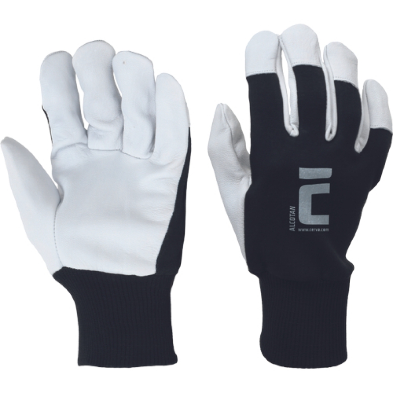 Rukavice z lícové kozinky v dlani, bavlněné tkaniny na hřbetu, s překrytými špičkami prstů a nápletem na zápěstí.