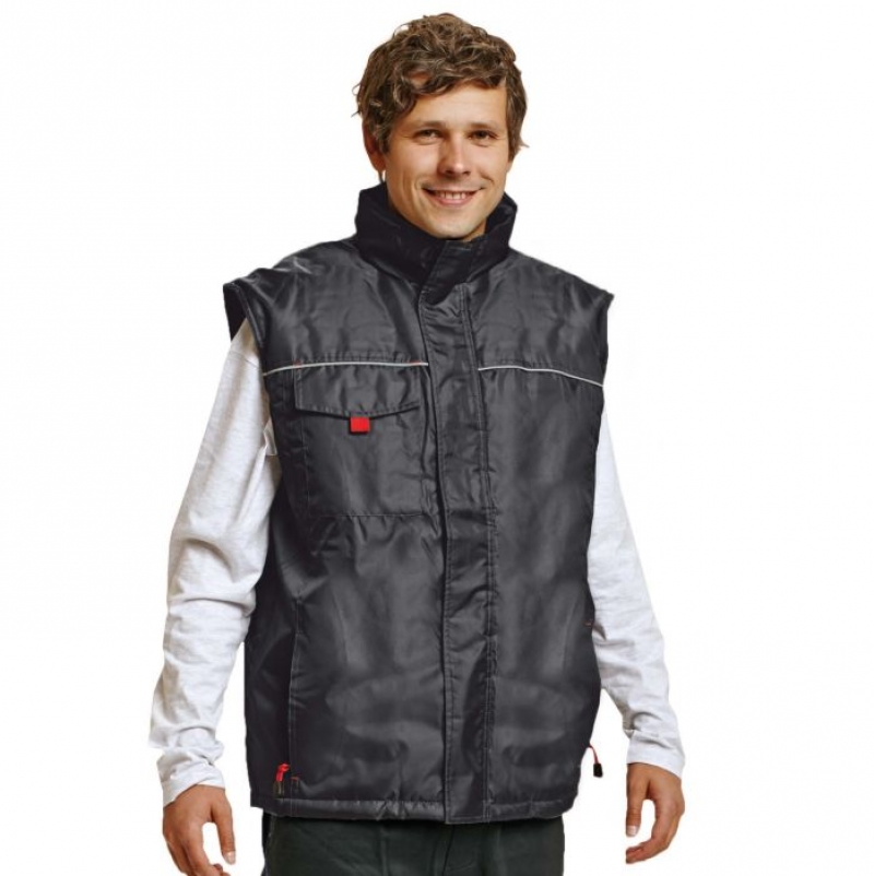 Zateplená nepromokavá vesta s překrytým zipem, se dvěma předními kapsami a náprsní kapsou na suchý zip.