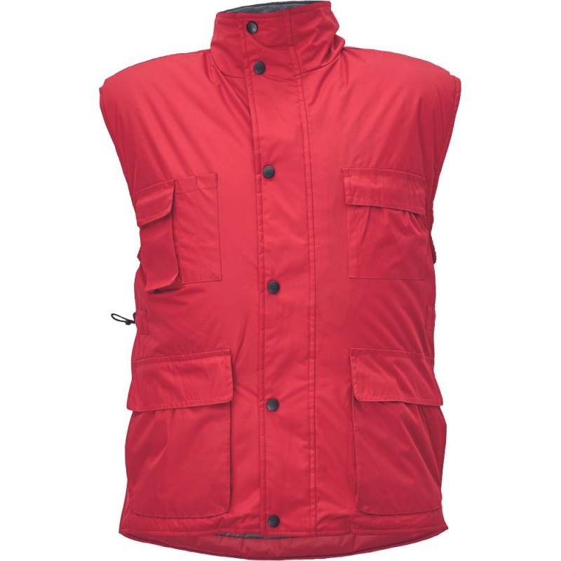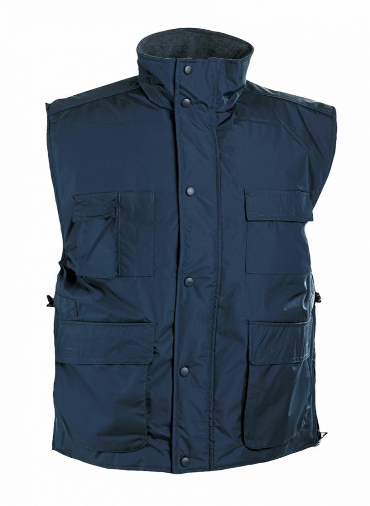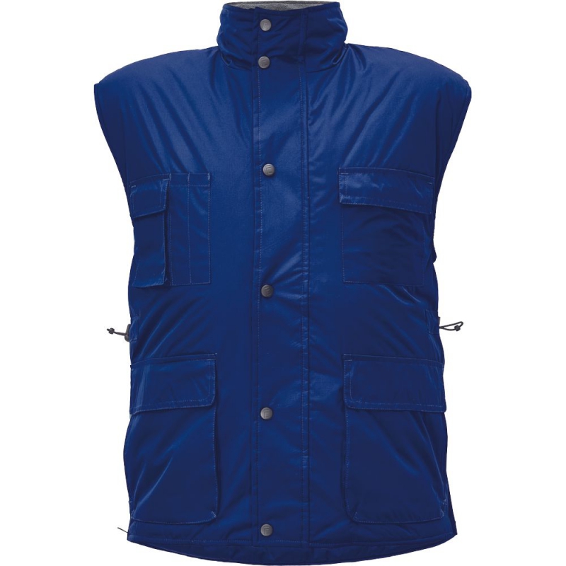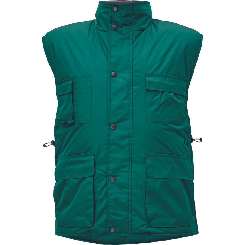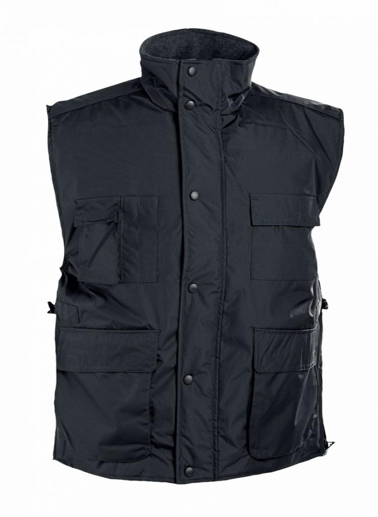 zateplená nepromokavá pánská zimní vesta; prodloužený díl na zádech; polyesterový materiál s mechanicky odolnou úpravou RipStop; 2 přední kapsy, 2 náprsní kapsy; spodní lem ke stažení na šňůrku; na bocích je polohování na zip pro regulaci obvodu vesty.