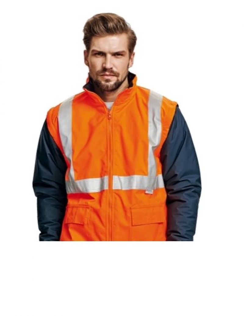 Pracovní pomůcky: zateplená Hi-Vis bunda 2 v 1 s reflexními pruhy • EN ISO 20471: 2013 • EN 343 3,1 • Voděodolné 3000 mm • odepínatelné tmavěmodré rukávy • pletené manžety • reflexní pásky 3M • barva oranžová a žlutá