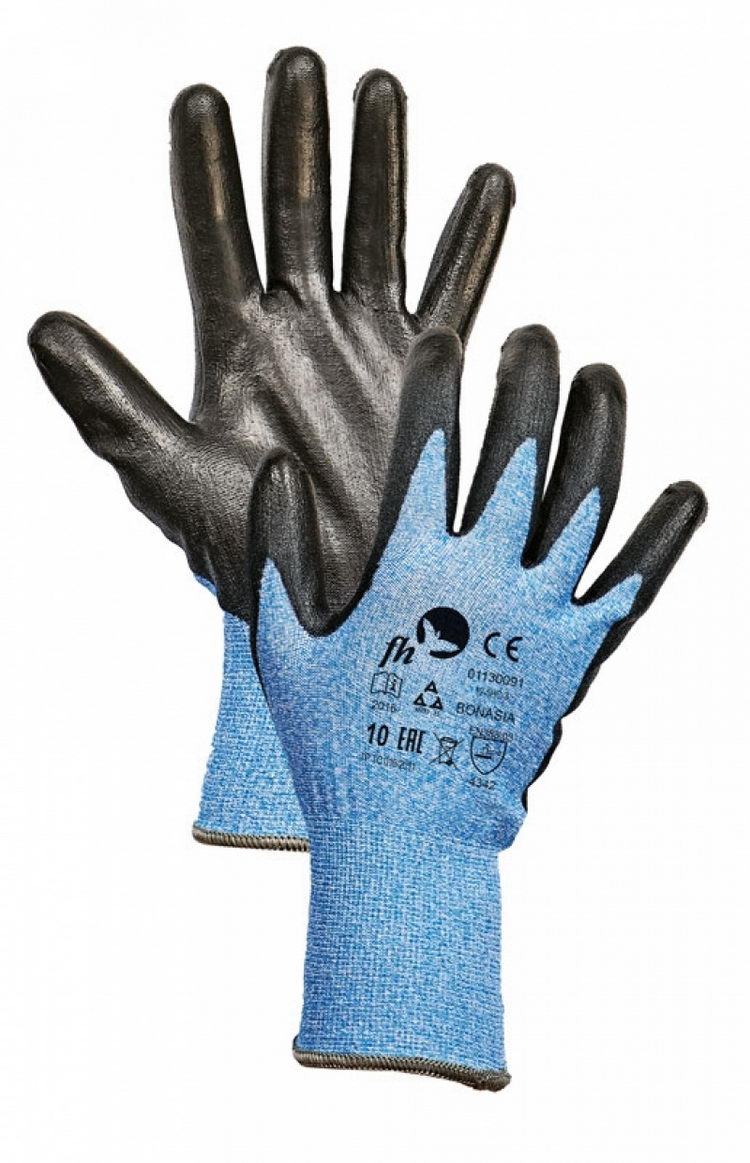 Pletené bezešvé rukavice kategorie prořezu 3, PU na dlani a na prstech, pružná manžeta.