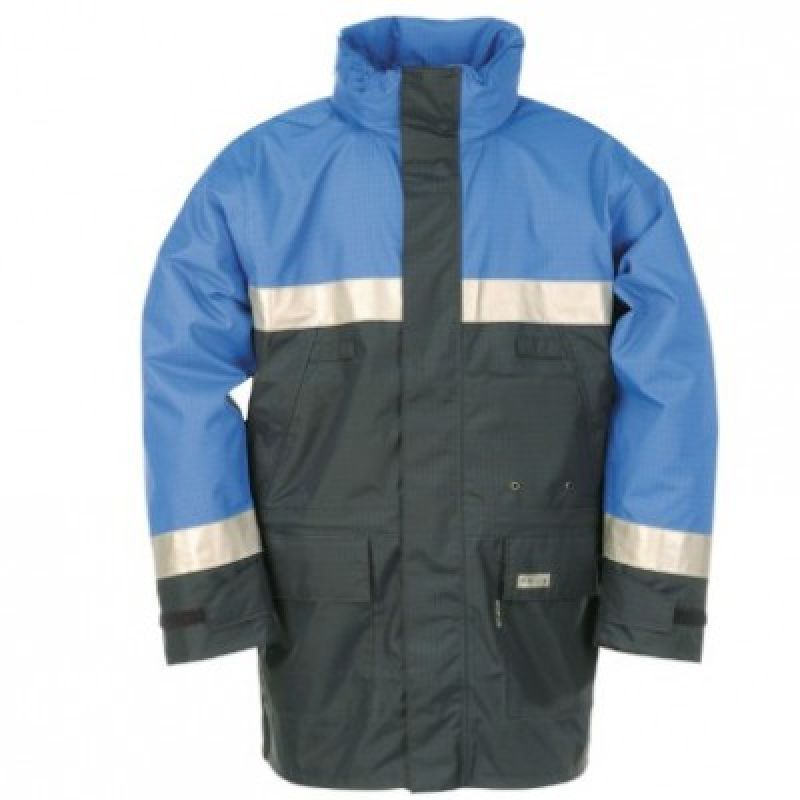 Bunda z materiálu SIOPOR FR AST s pevnou bavlněnou nehořlavou podšívkou, kapuce v límci, kapsa na mobil, přelepené švy, pevná nehořlavá podšívka Pyrovatex s vnitřní kapsou, antistatická, nehořlavá, chemicky odolná, EN 343, třída 3-2.