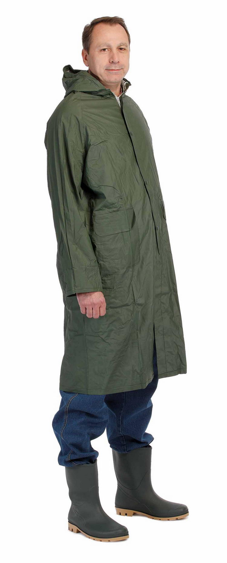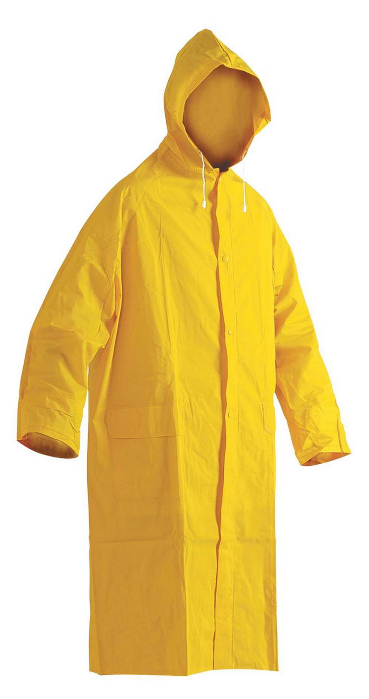 • voděodolný ¾ plášť s kapucí • prodloužená délka • všechny spojovací švy jsou zatavené • materiál s nánosem PVC • dvě přední kapsy kryté légami proti průniku vody • vnitřní manžeta na gumu • ventilace na zádech a v podpaží