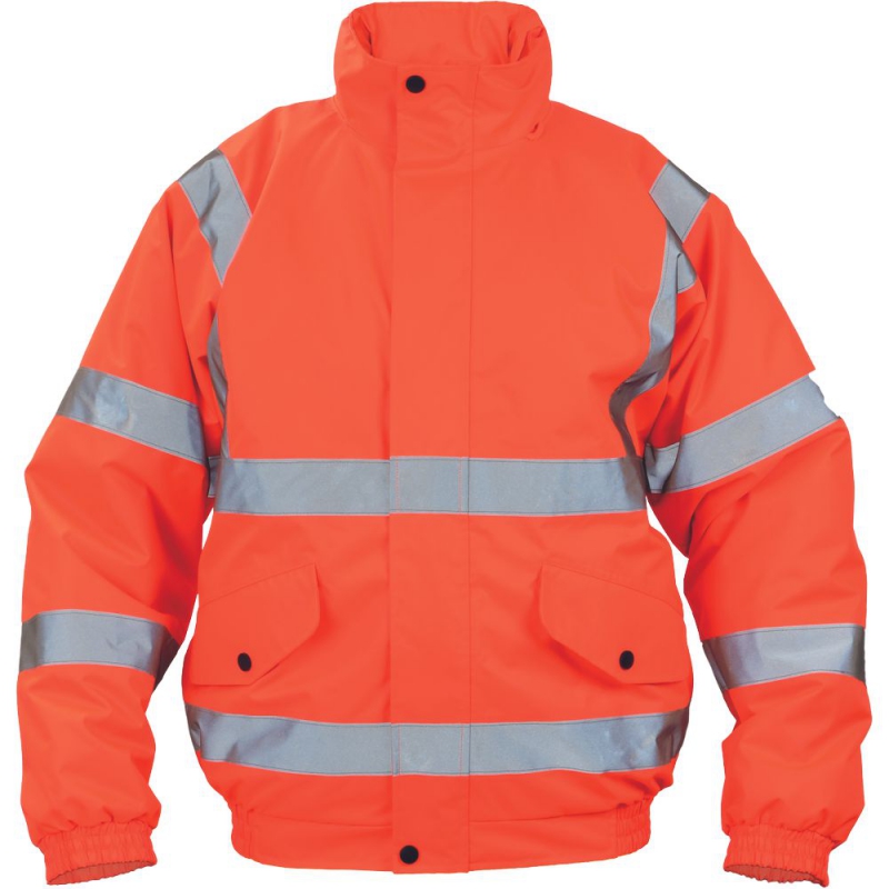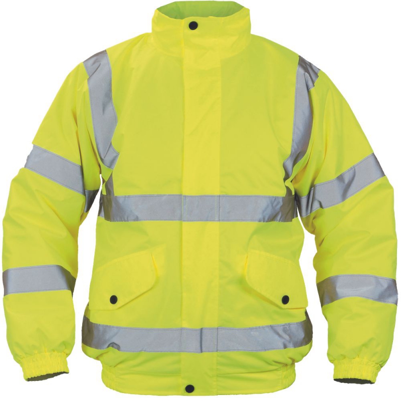 pánská HI-VIS zimní nepromokavá pilotní bunda s integrovanou kapucí, prodyšná; reflexní pruhy přes ramena a okolo hrudi, boků a rukávů; 2 boční kapsy s chlopní, 1 vnitřní kapsa; elastické manžety a spodní lem; zapínání na zip kryté légou.