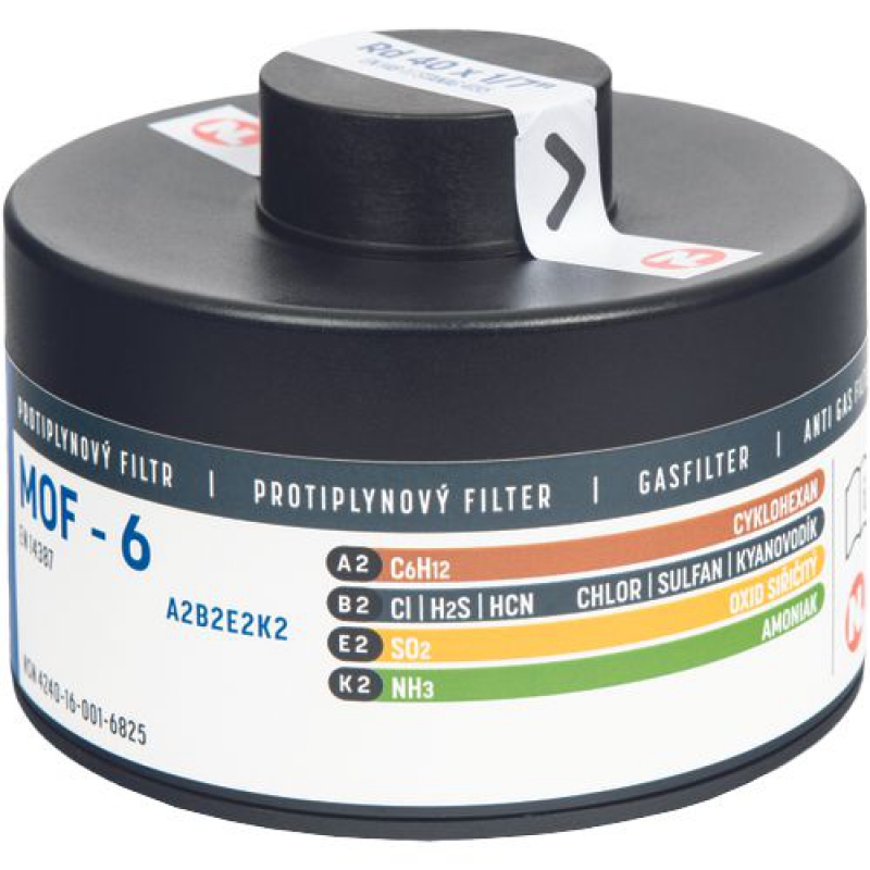 Ochranný filtr MoF – 6 protiplynový A2B2E2K2 Průměr x výška: 110 x 81mm Hmotnost: 3150g Dýchací odpor při: 30 l/min - 120 Pa, 95 l/min - 440 Pa Závitové připojení: EN 148-1 Rd 40x1/7”