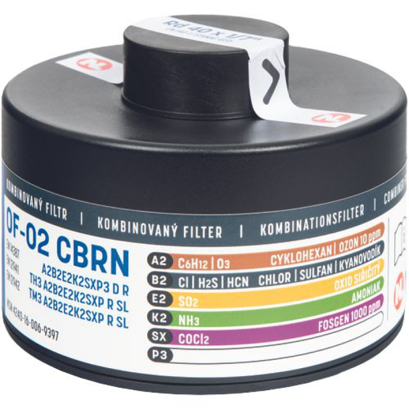 Ochranný filtr oF – 02 CBRn A2B2E2K2SXP3 D R Průměr x výška: 110 x 81mm Hmotnost: 3450g Dýchací odpor při: 30 l/min - 160 Pa, 95 l/min - 600 Pa Koeficient průniku: 99,99% Závitové připojení: EN 148-1 Rd 40x1/7”