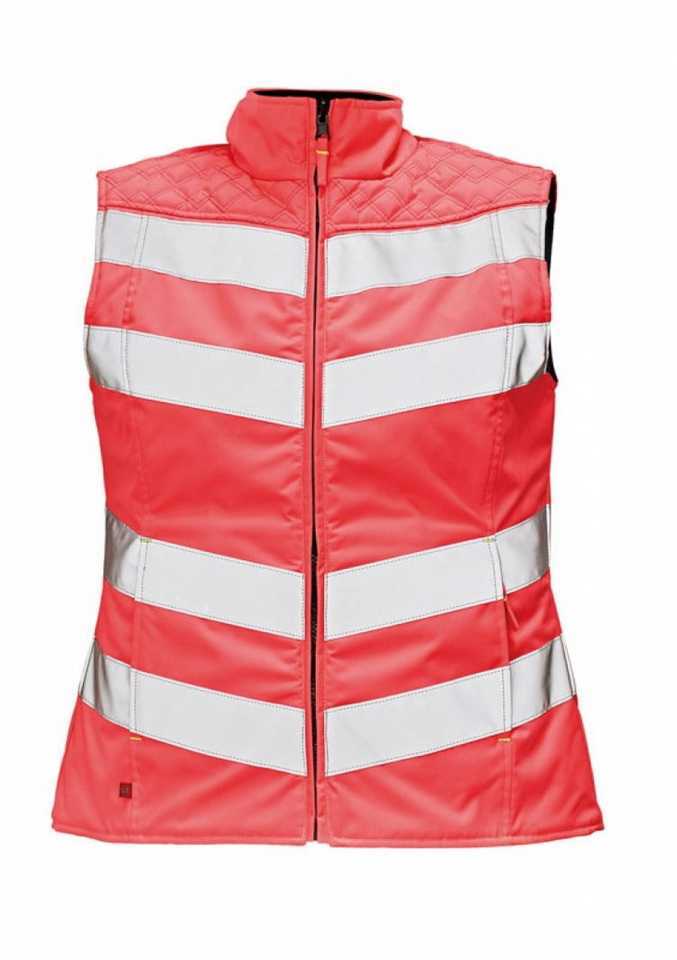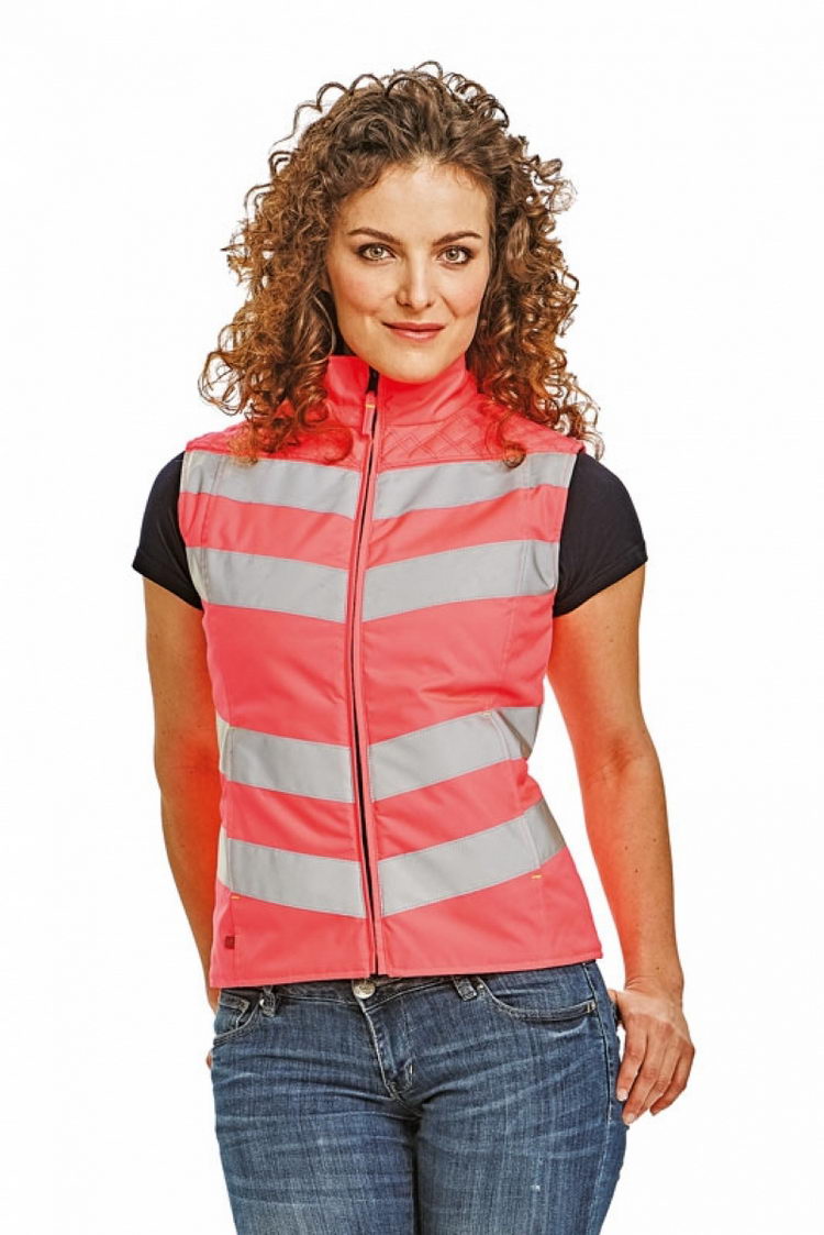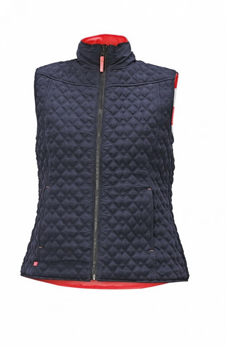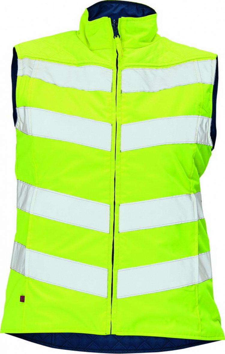 dámská oboustranná prošívaná vesta • jedna strana v hi-vis růžové barvě v kombinaci s reflektivními pásky • druhá strana tmavě modrá s dekorativním prošíváním • postranní kapsy na zip z obou stran vesty