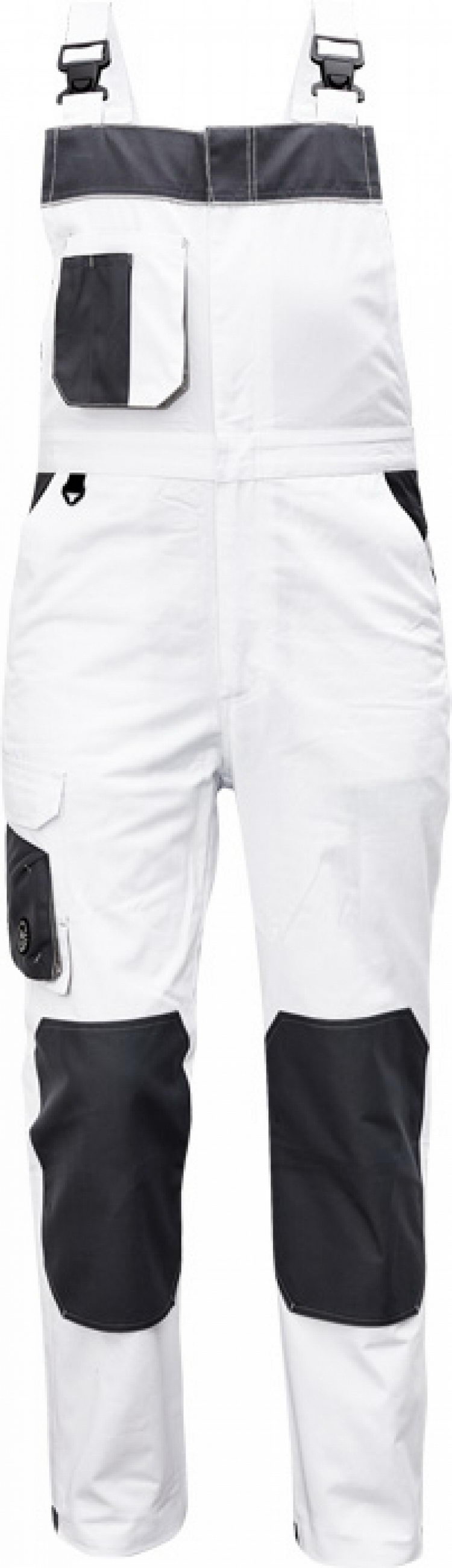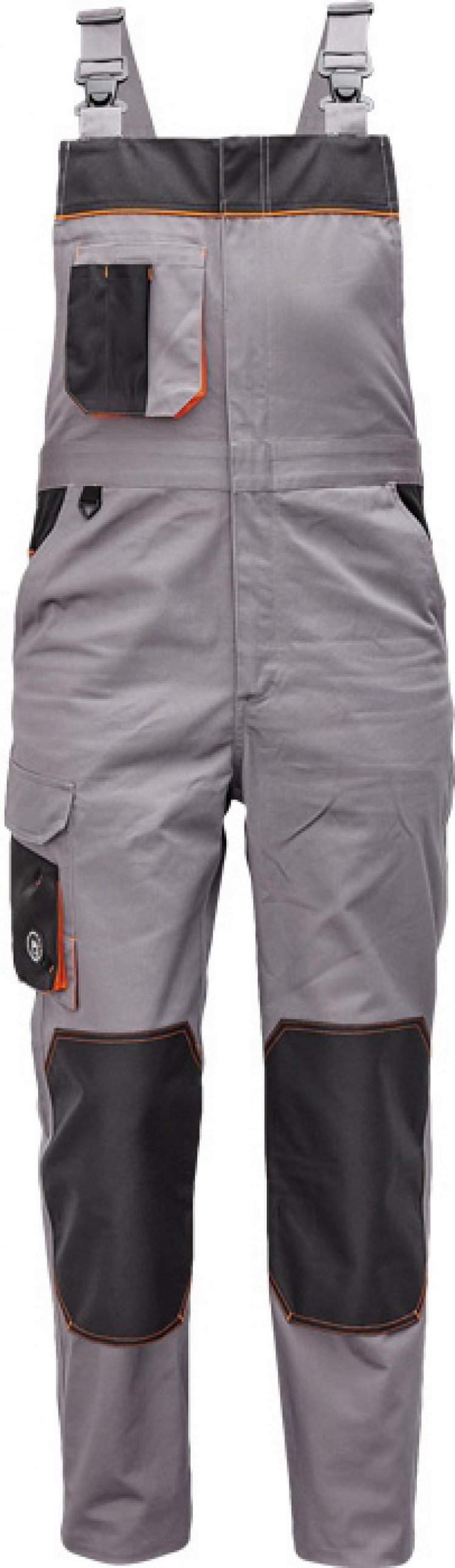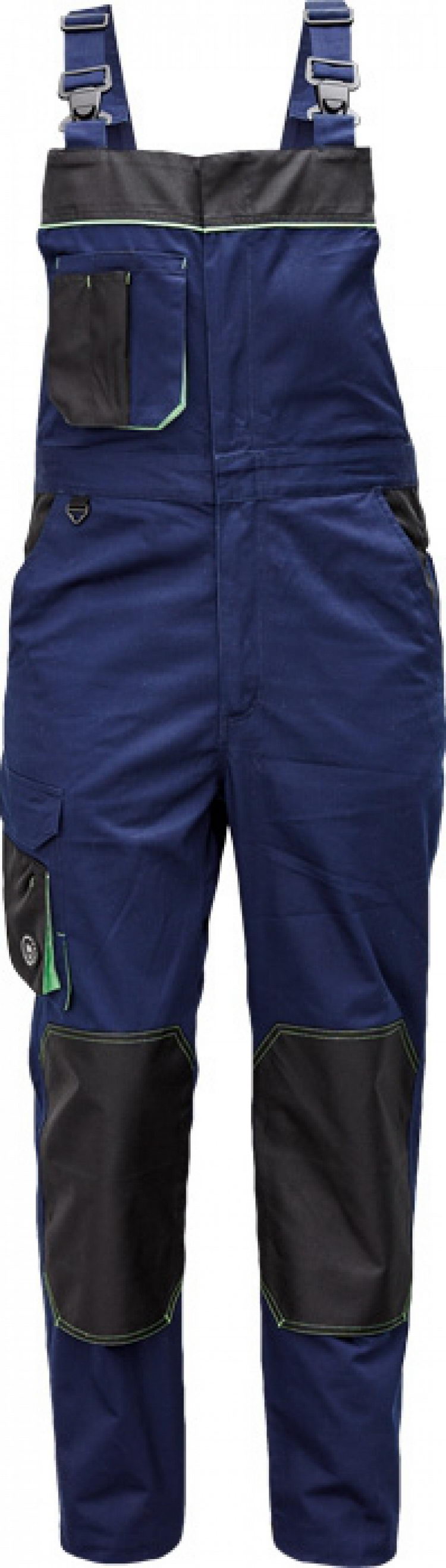 pánské pracovní kalhoty s laclem; materiál s vysokým procentem bavlněného podílu; moderní střih; zesílená oblast kolen materiálem Oxord s možností vkládání kolenních výztuh ; 2 postranní kapsy; 1 multifunkční kapsa na nohavici; 1 zadní kapsa se zapínáním na suchý zip; 1 náprsní multifunkční kapsa elastický pas; "D" kroužek; dvoucestný zip; kontrastní paspulky; nastavitelná délka nohavic