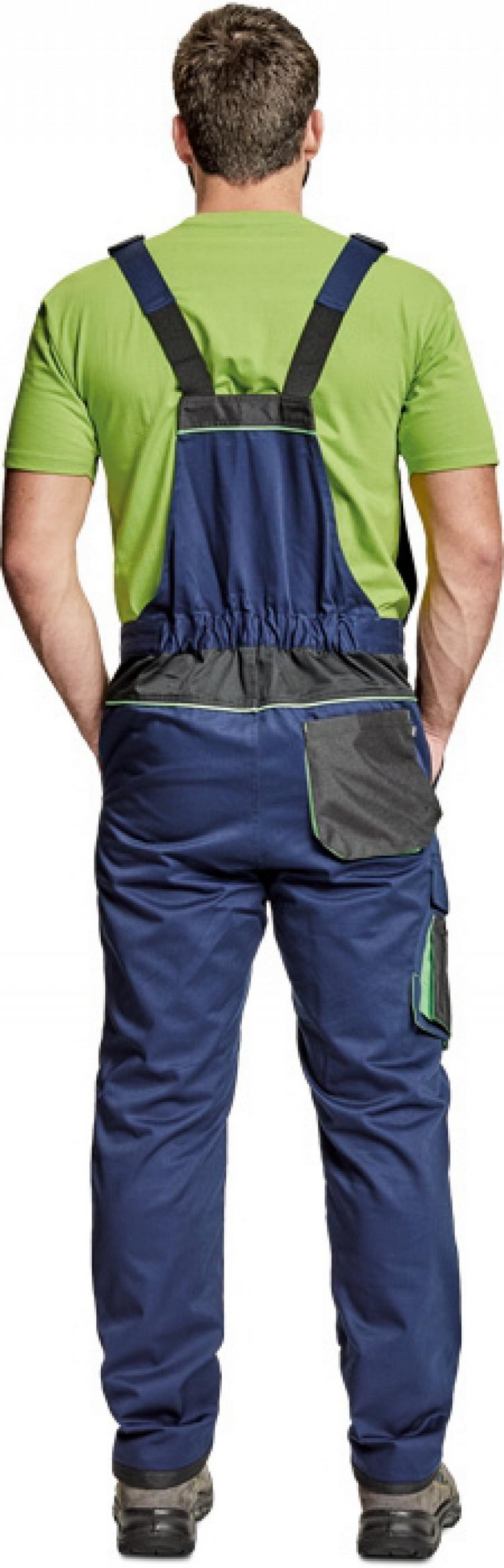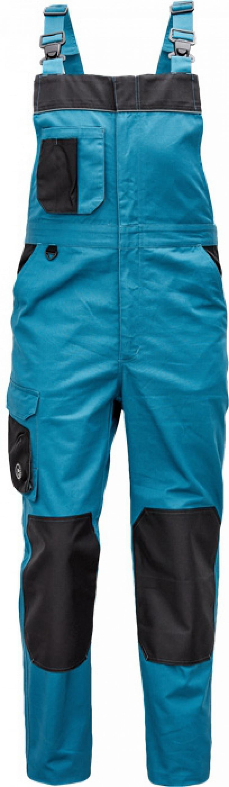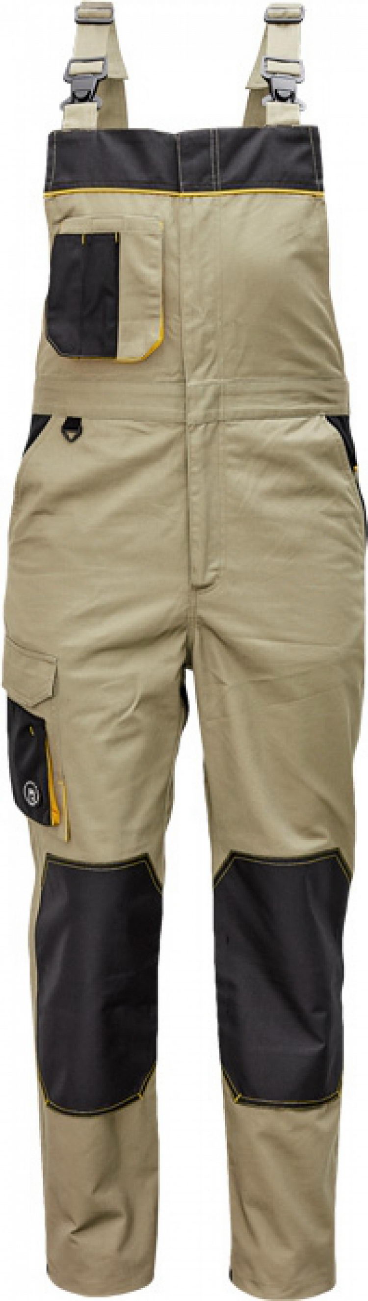 pánské pracovní kalhoty s laclem; materiál s vysokým procentem bavlněného podílu; moderní střih; zesílená oblast kolen materiálem Oxord s možností vkládání kolenních výztuh ; 2 postranní kapsy; 1 multifunkční kapsa na nohavici; 1 zadní kapsa se zapínáním na suchý zip; 1 náprsní multifunkční kapsa elastický pas; "D" kroužek; dvoucestný zip; kontrastní paspulky; nastavitelná délka nohavic