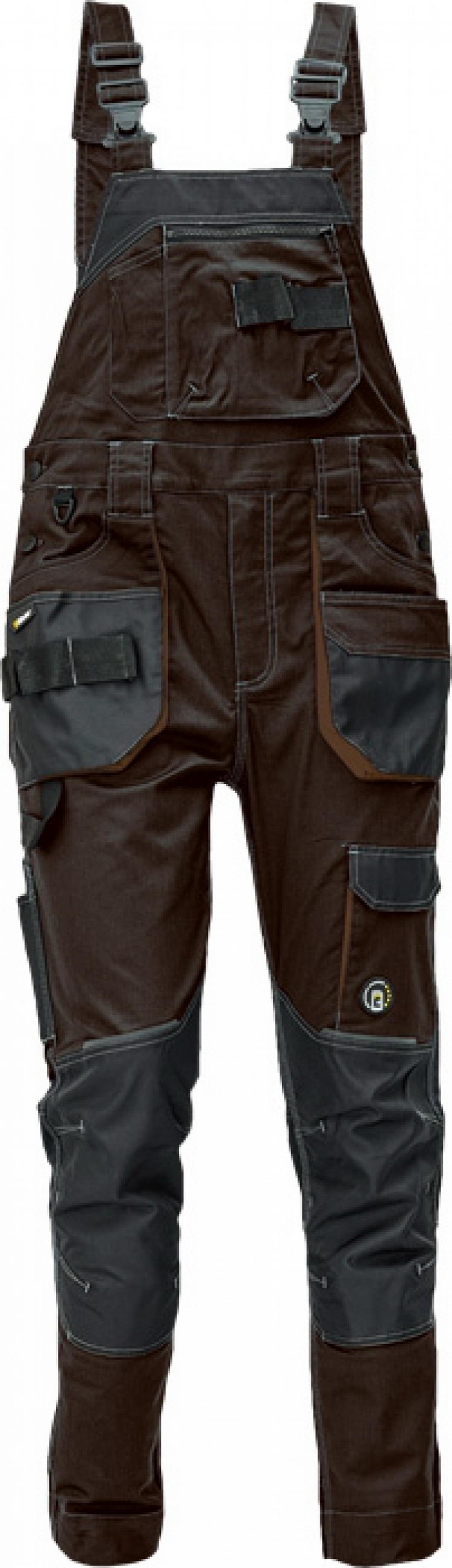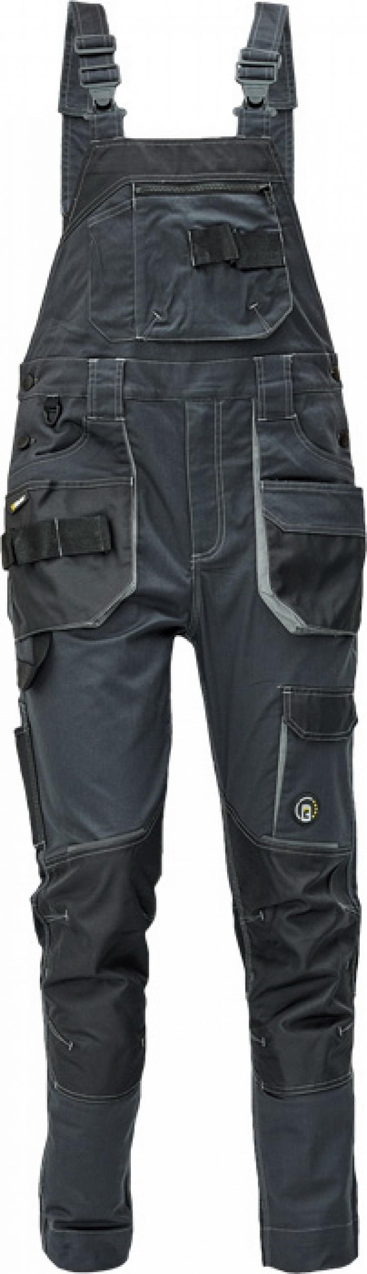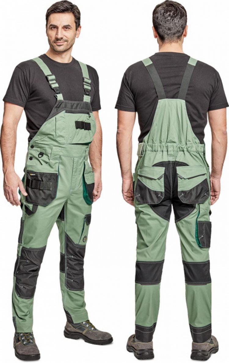 pánské pracovní kalhoty s laclem; elastický inovativní materiál TRIFIBETEX; ergonomický střih; pružný pas; odolné trojité prošití nohavic a sedu; zesílená kapsa na nákoleníky z materiálu Oxford; prostorné multifunkční přední kapsy s poutky na nářadí; 2 zadní kapsy s klopou zesílené Oxfordem; stehenní kapsa na telefon s klopou a zapínáním na suchý zip; kapsa na metr a nůž; poutko na kladivo; "D" kroužek; poutko nanářadí v pase; reflektivní prvky v barevném odstínu; nastavitelná délka nohavic