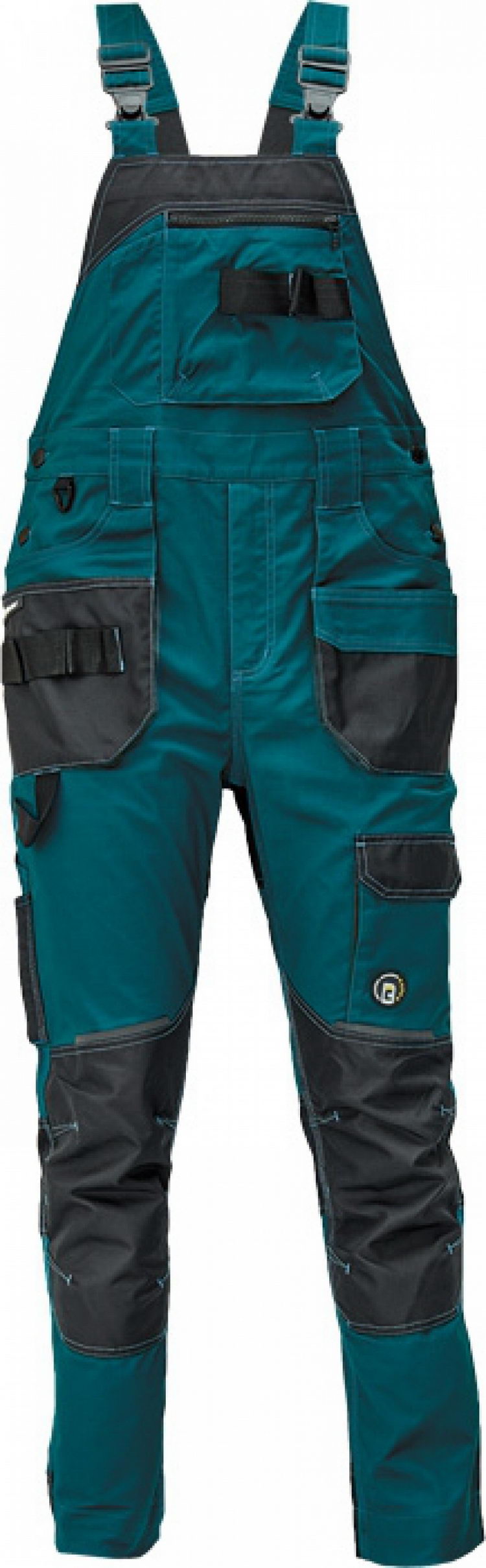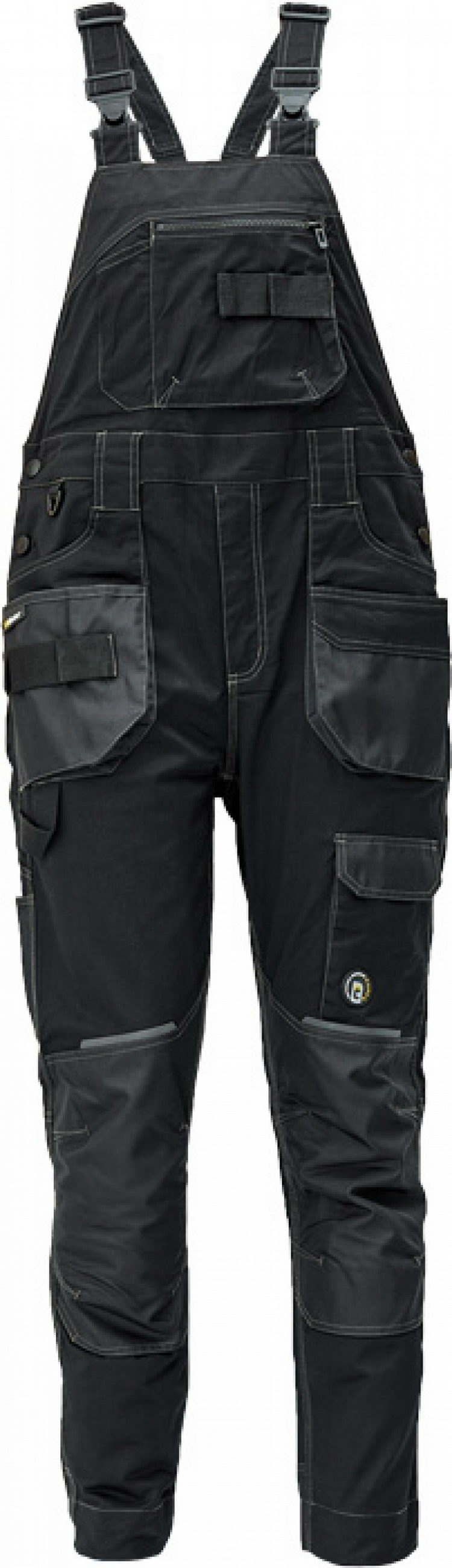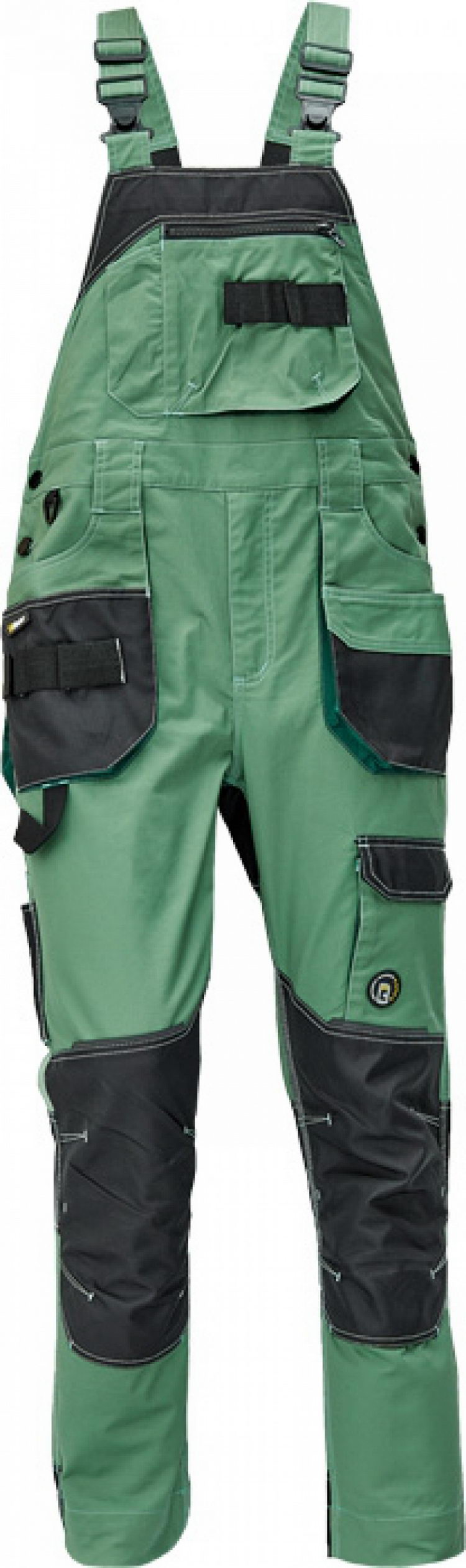 pánské pracovní kalhoty s laclem; elastický inovativní materiál TRIFIBETEX; ergonomický střih; pružný pas; odolné trojité prošití nohavic a sedu; zesílená kapsa na nákoleníky z materiálu Oxford; prostorné multifunkční přední kapsy s poutky na nářadí; 2 zadní kapsy s klopou zesílené Oxfordem; stehenní kapsa na telefon s klopou a zapínáním na suchý zip; kapsa na metr a nůž; poutko na kladivo; "D" kroužek; poutko nanářadí v pase; reflektivní prvky v barevném odstínu; nastavitelná délka nohavic