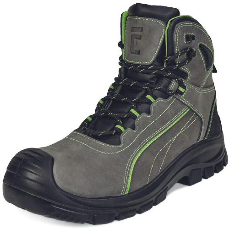 Bezpečnostní kotníková obuv s kompozitní tužinkou a aramidovou stélkou odolnou proti propíchnutí. Podešev z dvouhustotního PU s masivní ochranou vůči okopu. Svršek z voděodolné nubuk kůže.