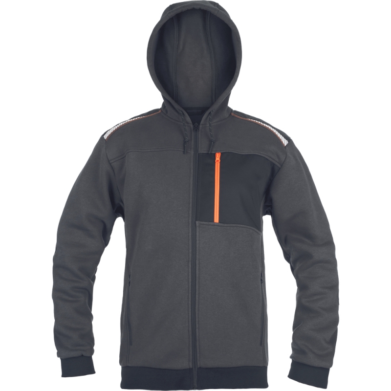 • pánská mikina s kapucí se zapínáním na zip • 2 boční kapsy • 1 náprsní kapsa na zip • zesílená ramena s reflexními pruhy • elastický spodní lem a manžety rukávů