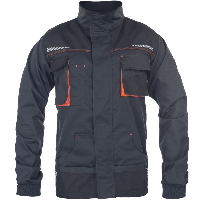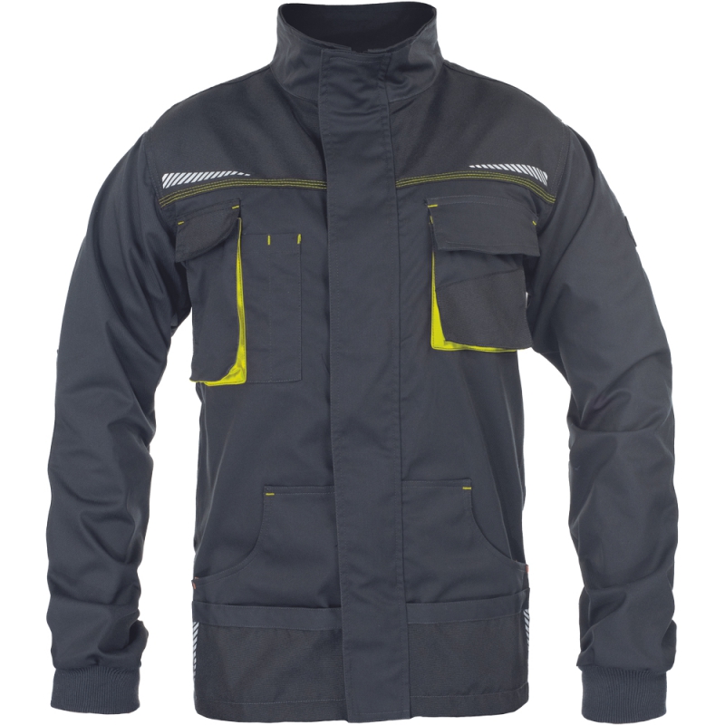• pánská vysoce odolná strečová pracovní bunda • přední zapínání na zip kryté légou • 2 boční kapsy • 2 náprsní kapsy, jedna na mobilní telefon • Oxford 600D zesílení v oblasti ramen a loktů • tištěné reflexní segmentové detaily • pletené elastické manžety rukávů