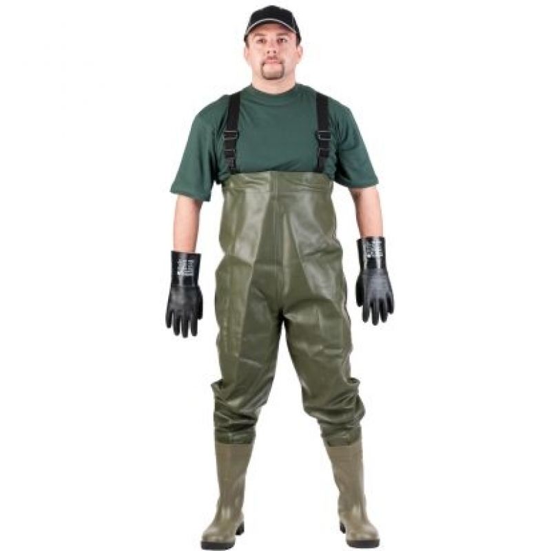 Prsačky s přeskami na šlích s vnitřní kapsou a elasticky stahovatelným pásem.S bezpečnostní obuví, mezipodešví a kovovou špičkou.