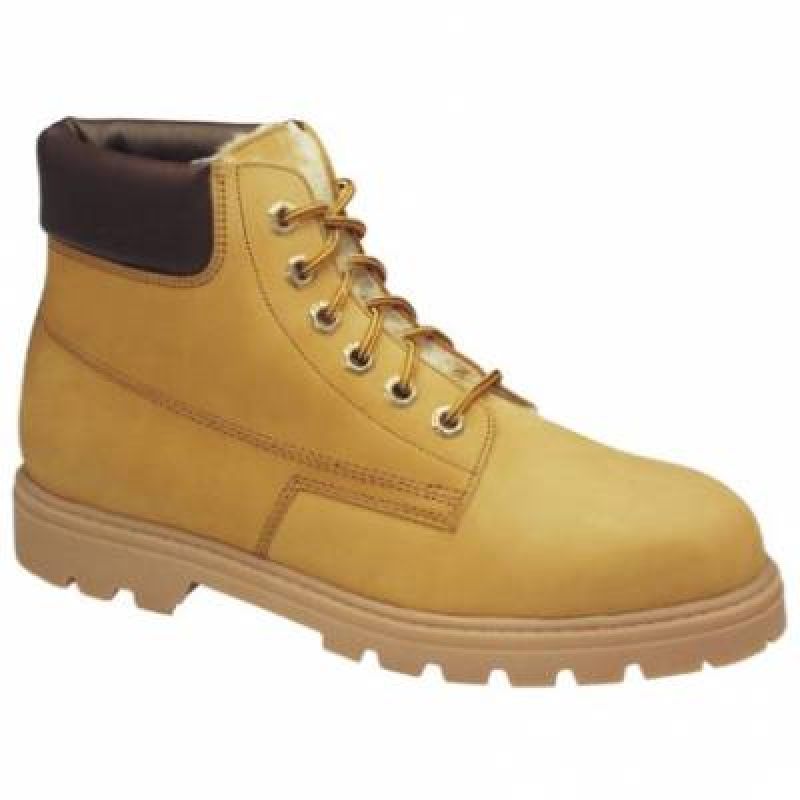 Okrová nebo hnědá kožená pracovní obuv zateplená umělou kožešinou.