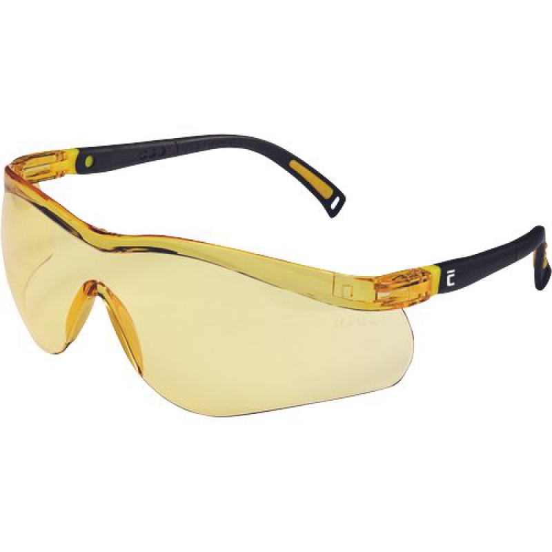 Brýle sportovního vzhledu optické třídy 1 se žlutým polykarbonátovým zorníkem s ochranným filtrem proti UV záření (dle normy EN 170), úpravou proti poškrábání a orosení (třídy F dle normy EN 166), ochranou proti malému nárazu a nastavitelným úhlem a delkou stranic.