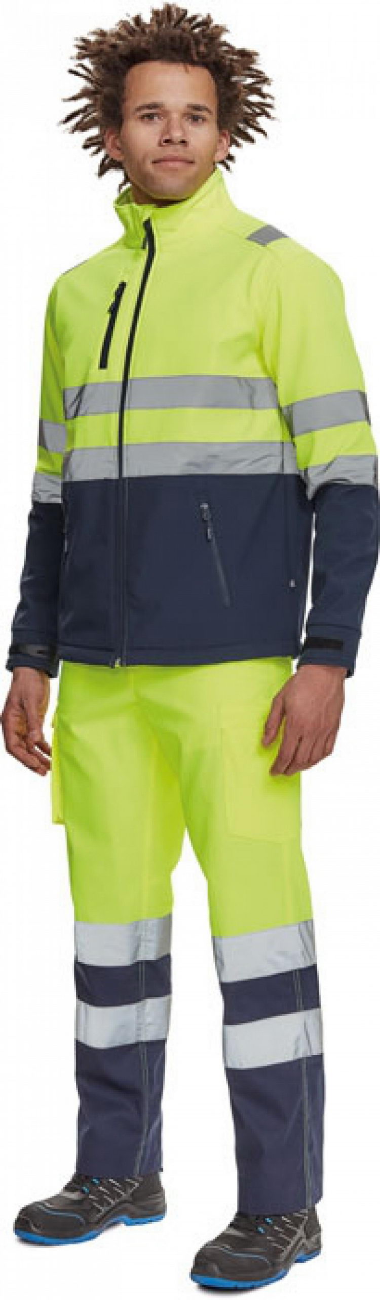 pánská Hi-Vis softshellová bunda s retroreflexními pruhy přes ramena, v bocích a na rukávech, prodyšná TPU membrána odolná dešti, zapínání na zip, 1 náprsní kapsa a 2 postranní kapsy na zip, elastické lemy rukávů a boků