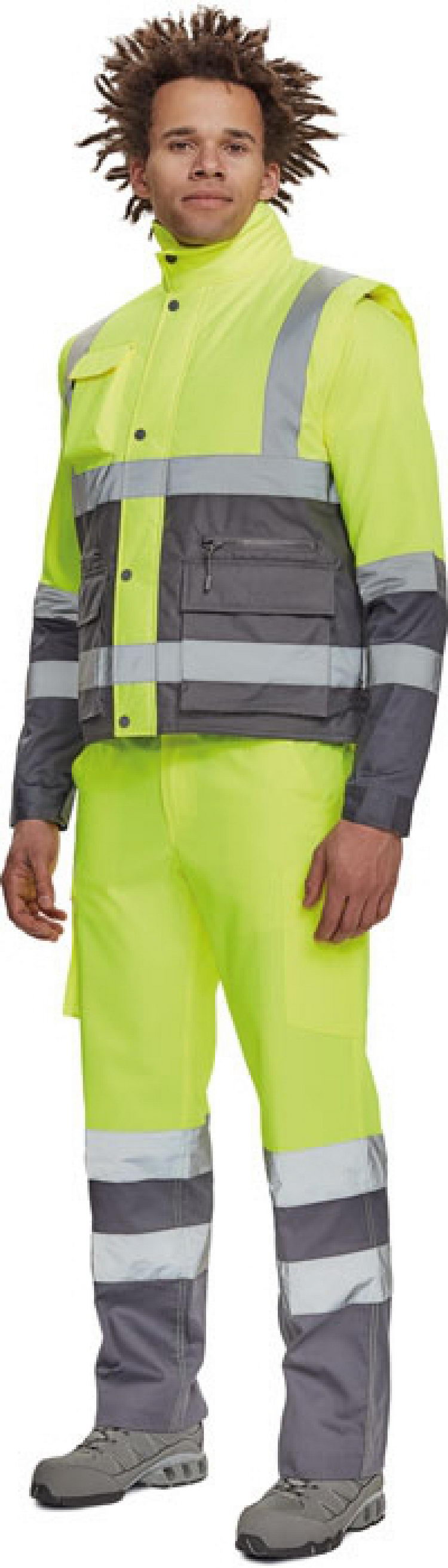 pánská zateplená Hi-Vis vesta s retroreflexními pruhy přes ramena a v bocích, kapuce skrytá v límci, zapínání na zip kryté légou se zapínáním na druky, 2 přední multifunkční kapsy s klopou a zapínáním na zip, 1 náprsní kapsa s klopou
