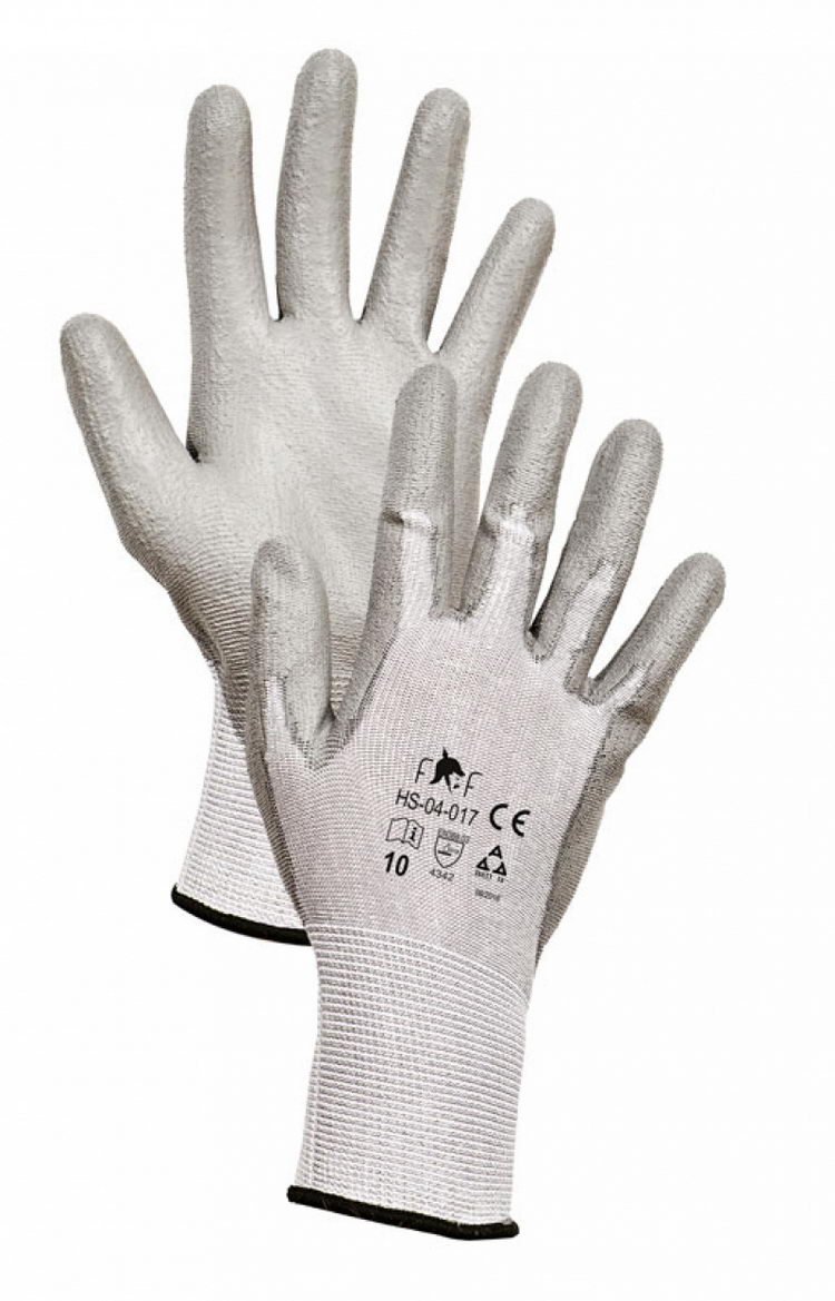 Pletené bezešvé rukavice kategorie prořezu 3, PU na dlani a na prstech, pružná manžeta.