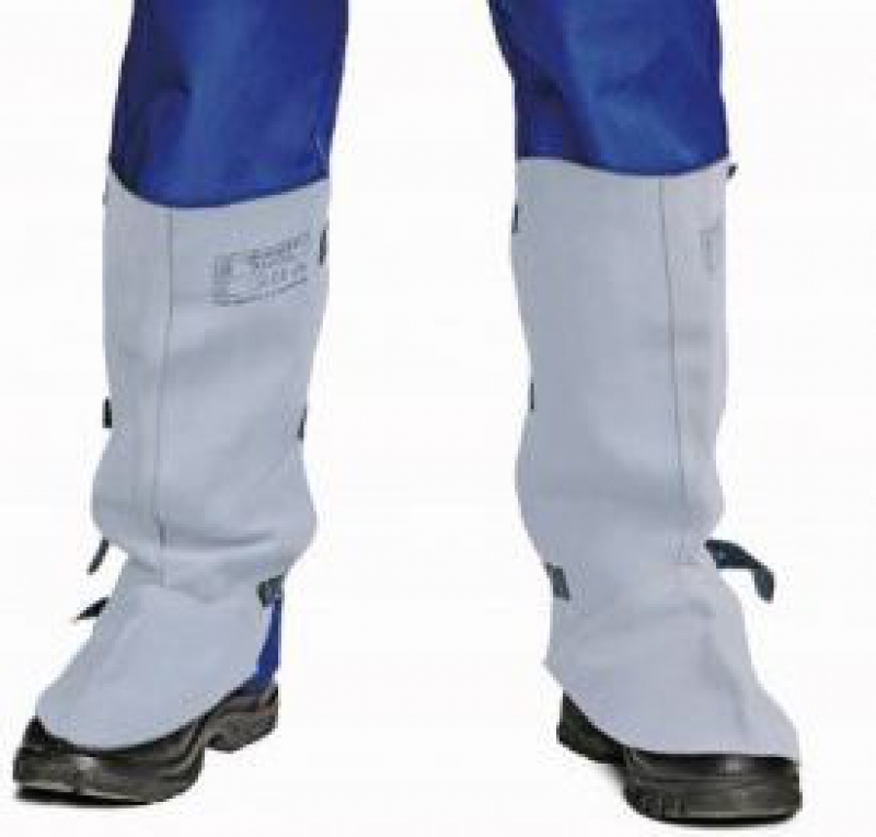 Svářečské kamaše vyrobené z šedé štípané hověziny se třemi upínacími pásky.