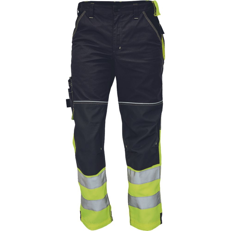 kvalitní pánské pracovní kalhoty v kombinaci s HI-VIS materiálem ve spodní části nohavic a 2 našitými reflexními pruhy; elastický pas; 5 funkčních kapes; 600D Oxford zesílená oblast kolen s možností vkládání kolenních výztuh; záložka na nohavici umožňující prodloužení délky až o 5 cm; dekorativní prošití a kontrastní prvky v HI-VIS barvě.