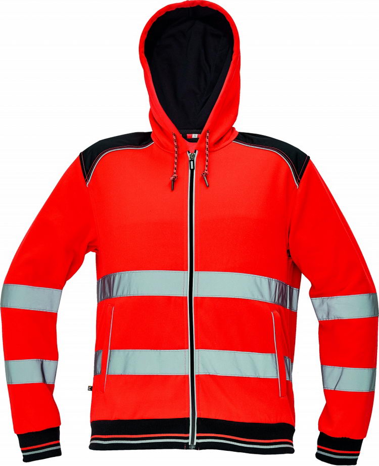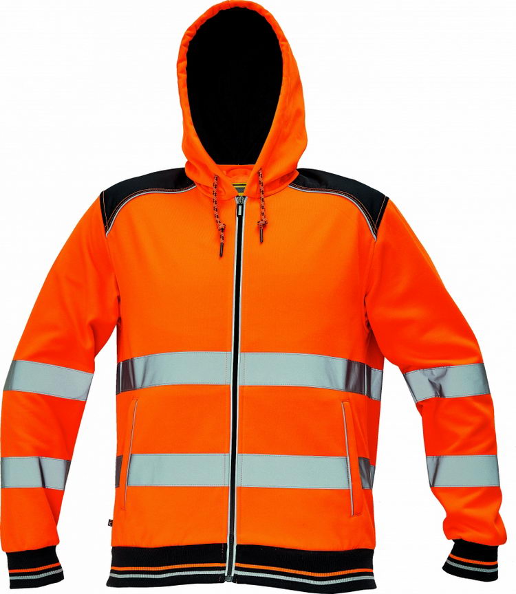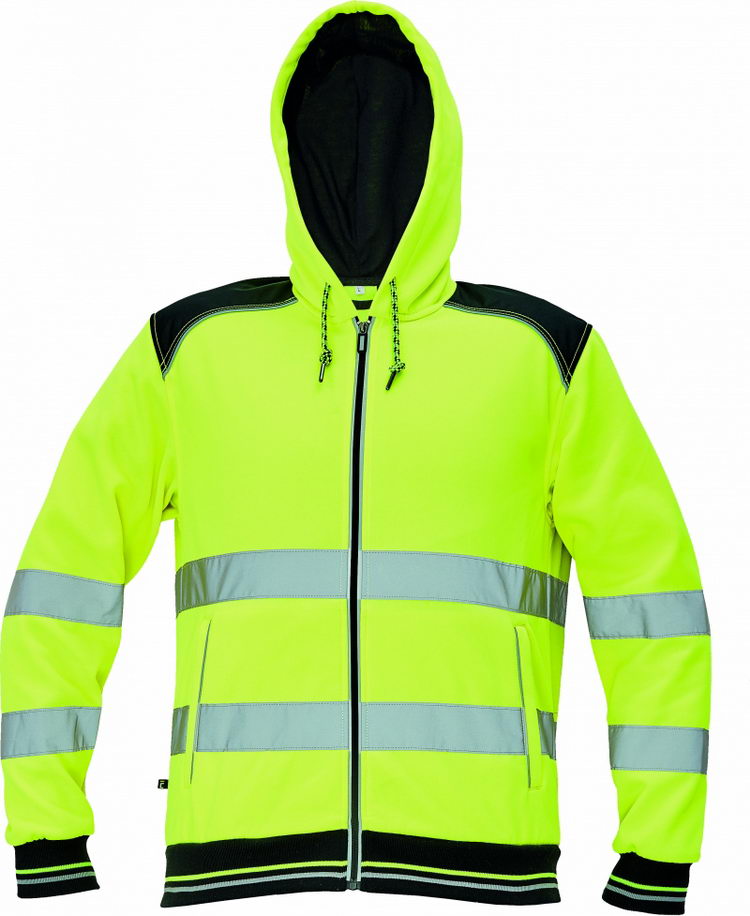 • pánská celopropínací mikina s kapucí v hi-vis provedení ze směsového úpletu polyesteru a bavlny • se 2 našitými reflexními pruhy po obvodu těla a rukávů, ze vnitř nepočesaná • zesílená oblast ramen a loktů • reflektivní paspulka lemující sedlo a lištové kapsy • dvojitá kapuce a dekorativního prošití • pružné náplety na rukávech a spodním obvodu