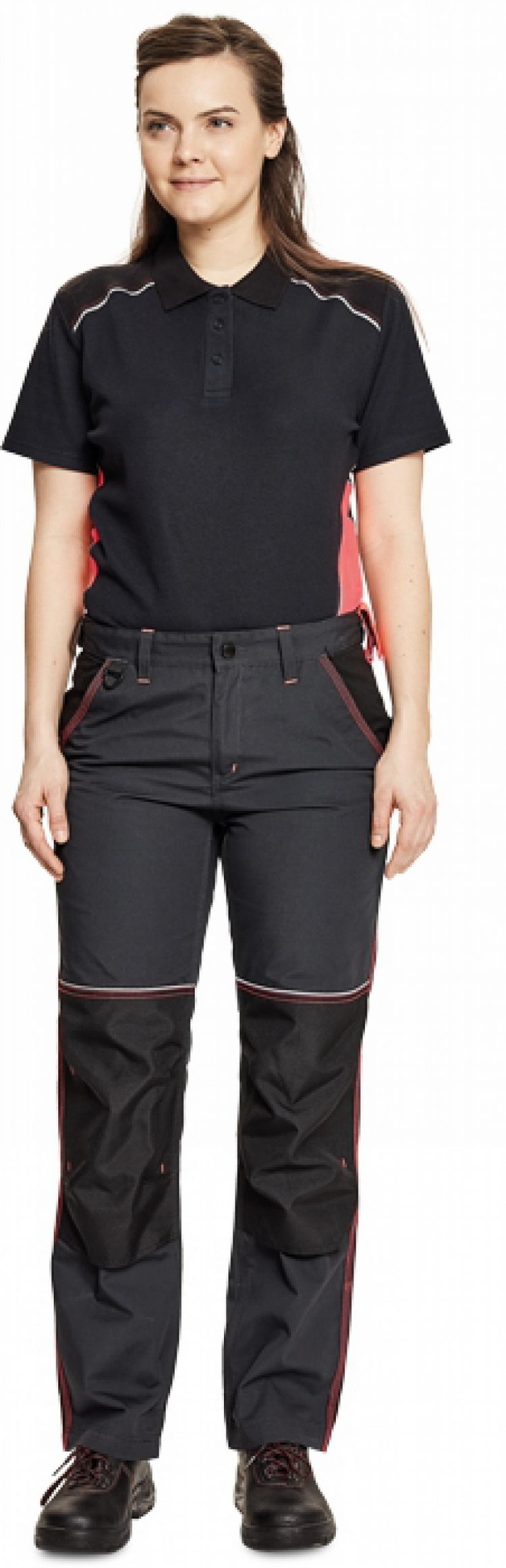 dámské pracovní klahoty s elastickým pasem; 2 postranní kapsy; D kroužek pro přichycení identifikační karty; 2 nakládané zadní kapsy s patkou; poutko na nářadí v kontrastní barvě; zesílená oblast kolen s možností vkládání kolenních výztuh; záložka na nohavici umožňující prodloužení délky až o 5 cm; zesílená zadní strana spodku nohavice; dekorativní prošití a kontrastní prvky v hi-vis barvě