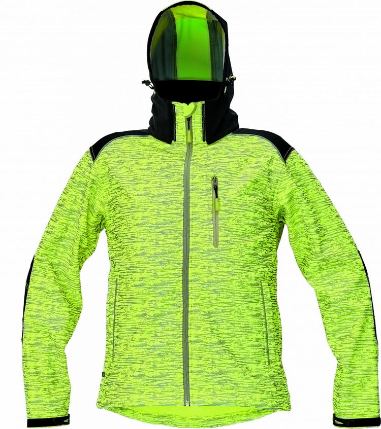 • pánská softshellová bunda s reflektivním dekorativním potiskem na fluorescentním podkladu • zesílená oblast ramen a loktů • 1 náprsní kapsa na zip • 2 postranní lištové kapsy • 2 uzavíratelné vnitřní kapsy • odnímatelná kapuce s efektním uchycením • reflektivní paspulka lemující sedlo a boční kapsy • nastavitelná šíře spodního obvodu a rukávů