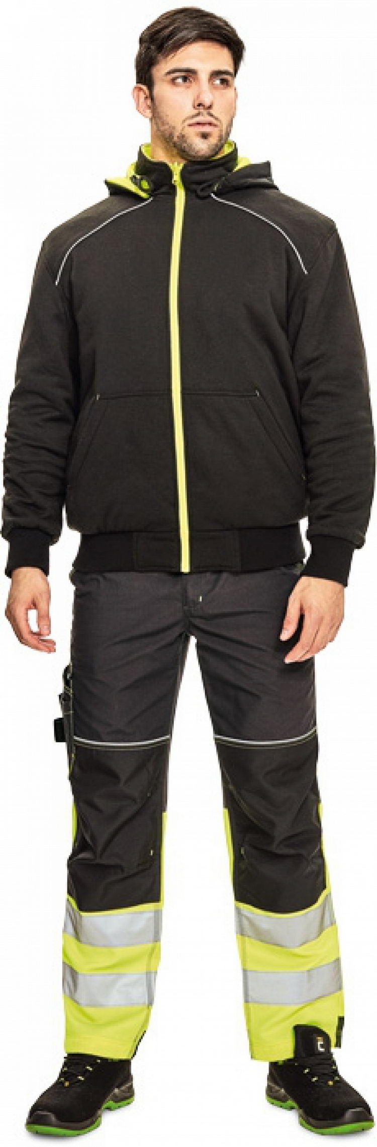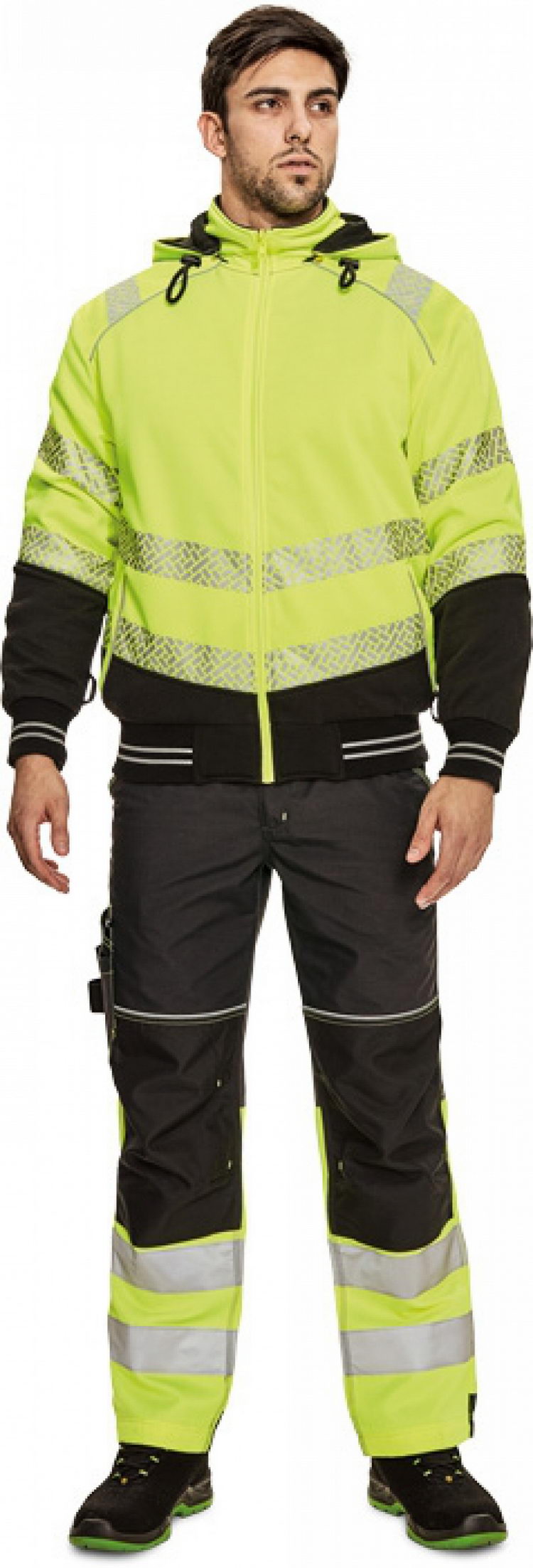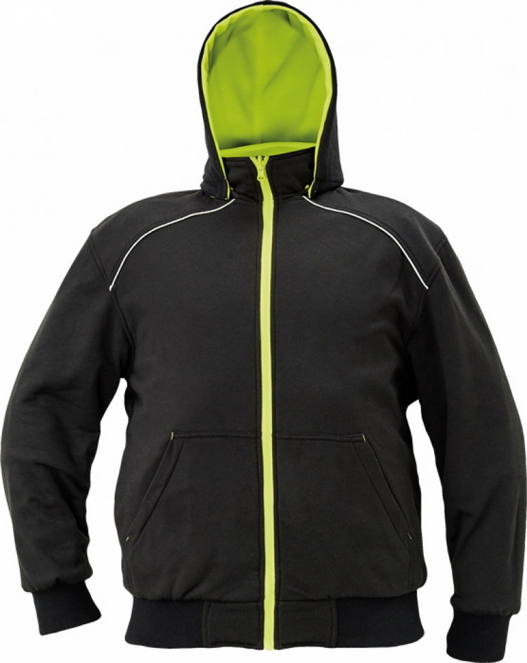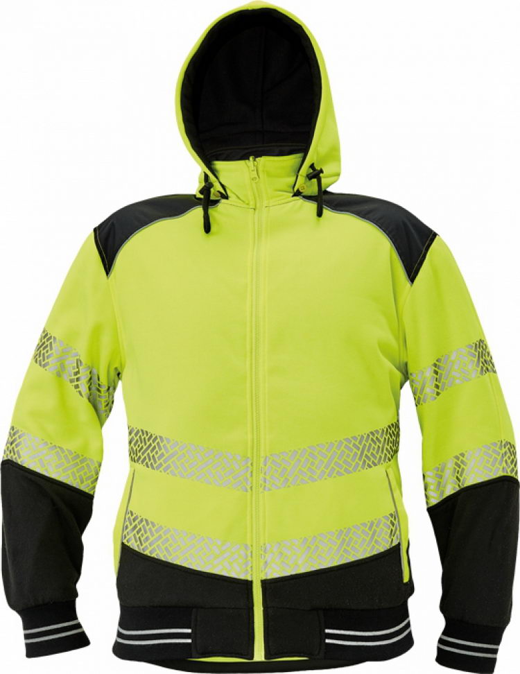 pánská oboustranná mikina na zip s odnímatelnou kapucí; hi-vis verze se segmentovanými reflexními pruhy a reflexními paspulkami; 2 postranní lištové kapsy; pružné náplety ve spodním obvodu a na koncích rukávů; 2 verze v černé barvě s klokaní kapsou a reflexní paspulkou