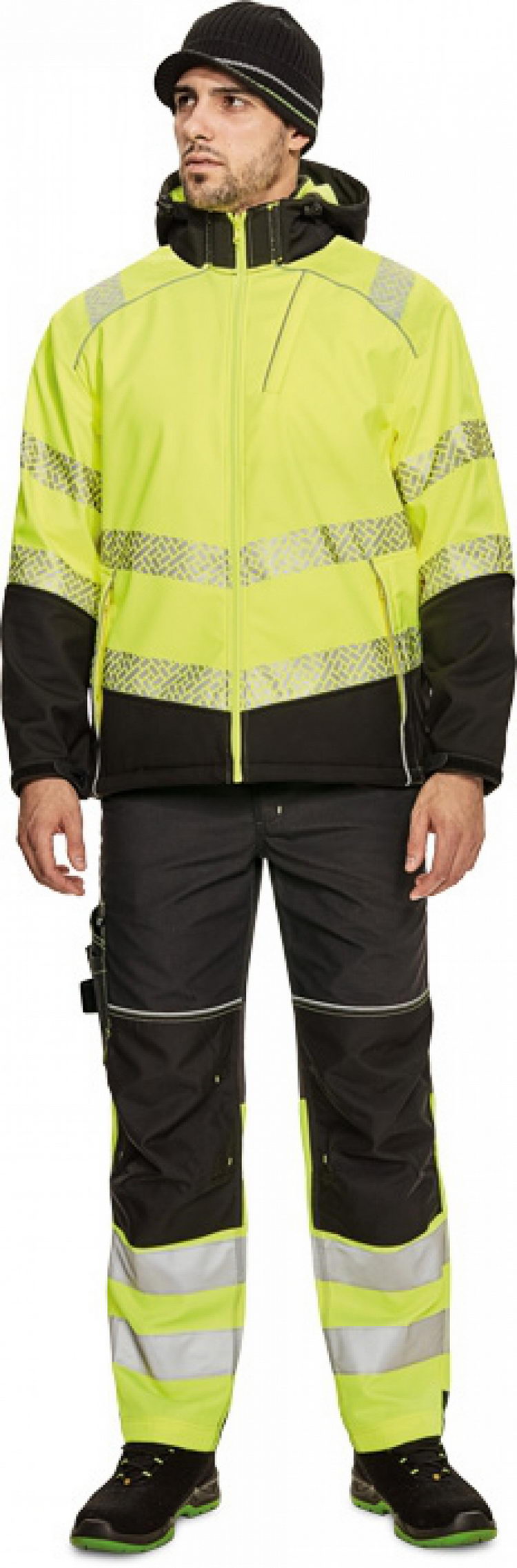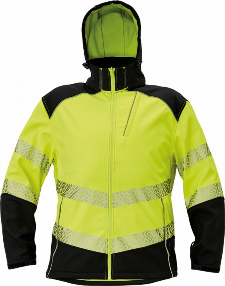 pánská softshellová bunda v hi-vis provedení zateplená fleecem s odnímatelnou kapucí; 2 postranní kapsy na zip; 1 náprsní kapsa na zip; segmentované reflexní pruhy a reflexní paspulky; nastavitelná šíře spodního obvodu pomocí stahovací šňůrky; nastavitelná šíře obvodu rukávů;