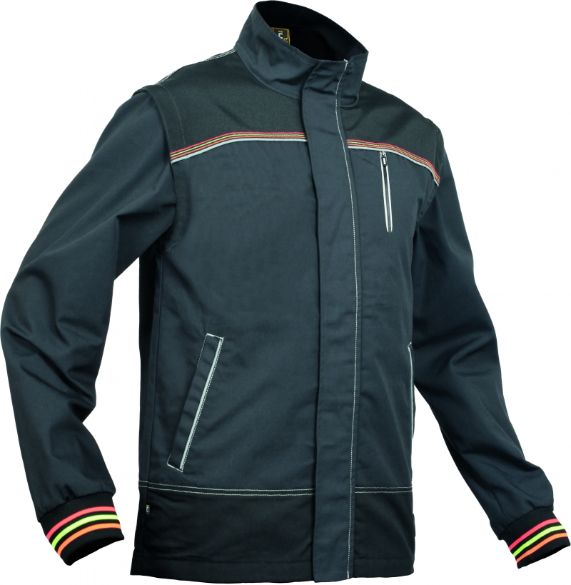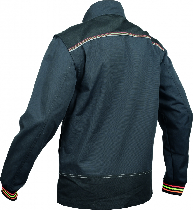 • pánská pracovní bunda moderního střihu se stojáčkem • hluboké postranní kapsy • multifunkční náprsní kapsa • D kroužek pro přichycení identifikační karty • zesílená oblast ramen • náplety na rukávech • prošití kontrastní nití v hi-vis barevném odstínu