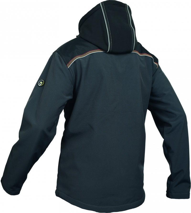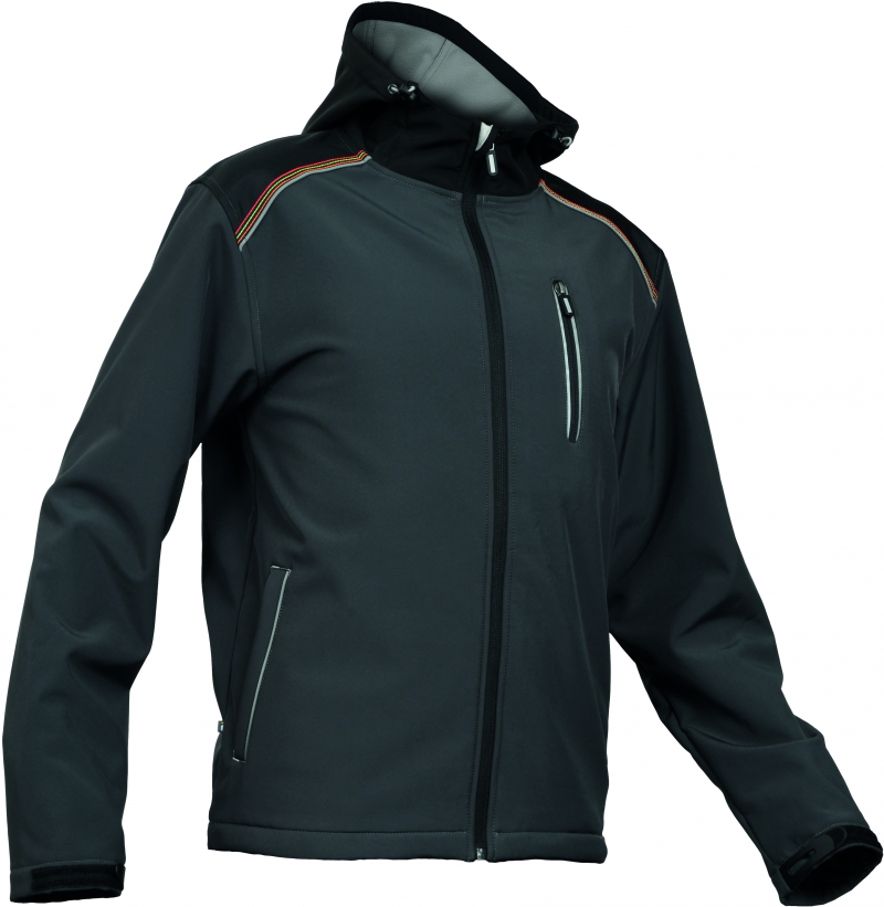 pánská sofsthellová bunda s odnímatelnou kapucí, s PU membránou zajišťující voděodolnost a paropropustnost; zesílená oblast ramen a loktů; 1 náprsní kapsa na zip; 2 postranní lištové kapsy; 2 uzavíratelné vnitřní kapsy; reflexní paspulka lemující sedlo a boční kapsy; nastavitelná šíře spodního obvodu a rukávů