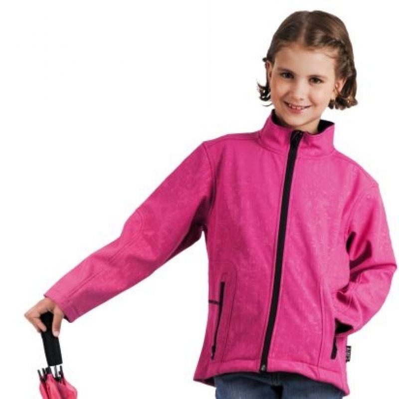 Dětská soft shellová bunda v atraktivním barevném provedení, prodyšná a voděodolná s měkkým mikro fleecem uvnitř 94% polyester 6% spandex, 320g/m2, 10000mm, 3000mvp.