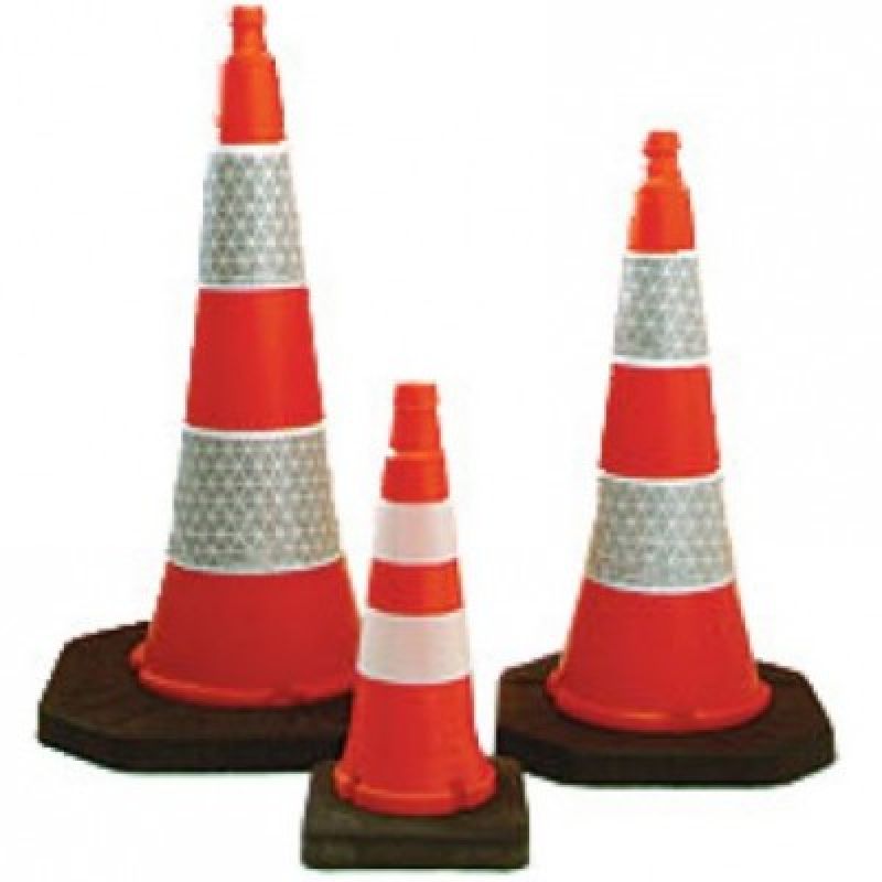 Vysoce kvalitní plastový kužel s robustní konstrukcí, černým podstavcem a reflexními pruhy, k dispozici ve velikostech 50 cm (20“), 75 cm (30“), 1 m (39“), s možností potisku.