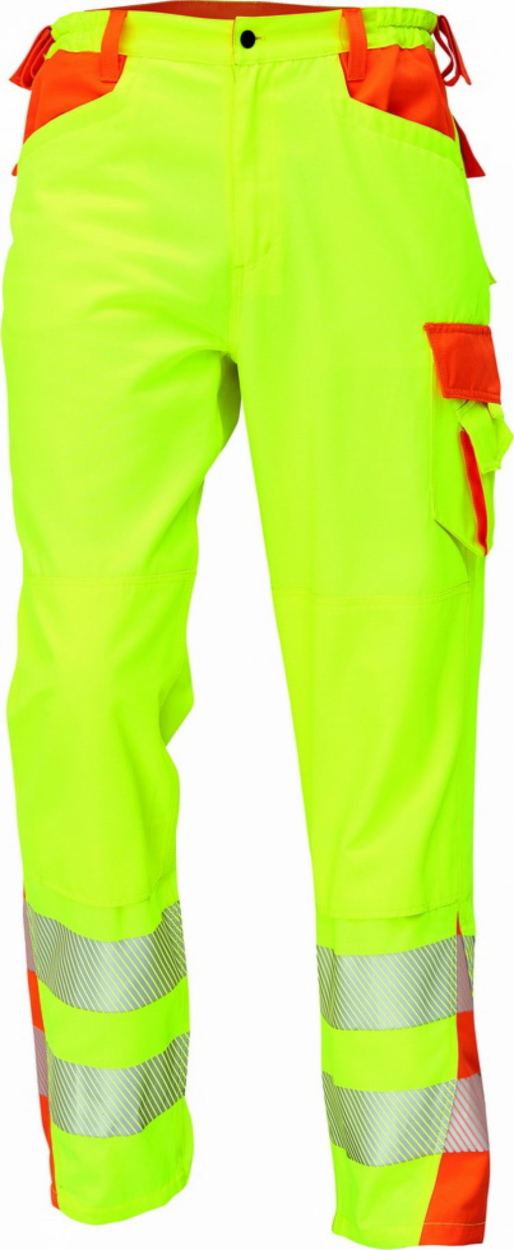 • pánské kalhoty v atraktivním provedení kombinace 2 hi-vis barev s reflexními natištěnými pruhy • 2 hluboké přední kaspy • 2 multifukční kapsy po stranách nohavice • 2 zadní kapsy s patkou • elastický pas a poutko na nářadí