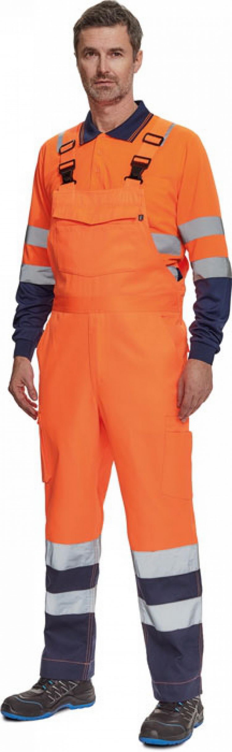 pánské Hi-Vis pracovní kalhoty s laclem a reflexními 7 cm pruhy na nohavicích, elastický pas, 2 boční kapsy + 1 kapsička na drobné, 2 multifunkční stehenní kapsy, 2 zadní kapsy, 1 velká multifunkční náprsní kapsa, elastické šle se zapínáním na sponu, nastavitelná délka nohavic