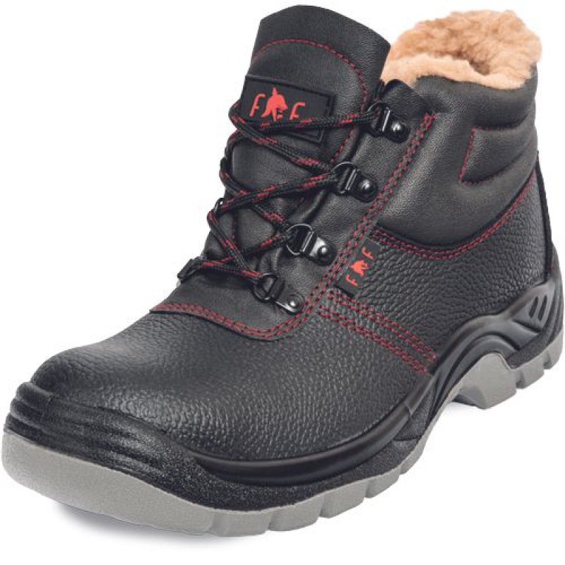 Bezpečnostní kotníková obuv s ocelovou tužinkou, zateplené umělým kožíškem, PU/PU podrážkou, rezistentní olejům. Svršek – reliéfní štípaná kůže.