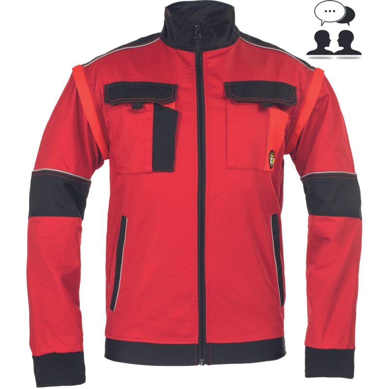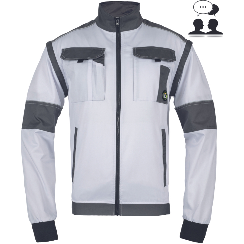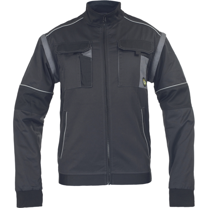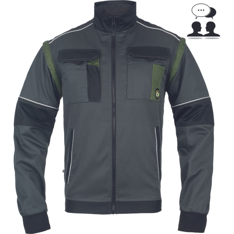 • pánská pracovní bunda se zapínáním na zip krytým légou • 2 boční kapsy • 2 náprsní kapsy s klopou na suchý zip • zesílení namáhaných částí ramen • odepínací rukávy s pružnými manžetami • pružný spodní obvod v pase • reflexní prvky