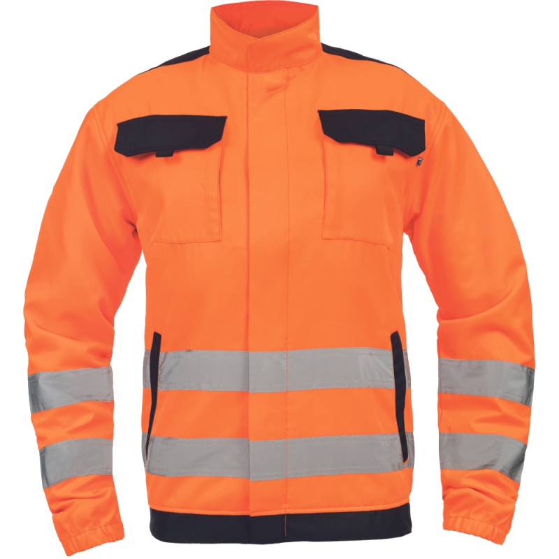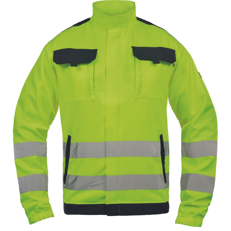 • unisex HI-VIS pracovní bunda se zapínáním na zip krytým légou • 2 boční kapsy • 2 náprsní kapsy s klopou na suchý zip • 2 šité 5 cm široké reflexní pruhy přes boky a spodní rukávy • zesílení namáhaných částí ramen • pružné manžety rukávů a spodní obvod v pase