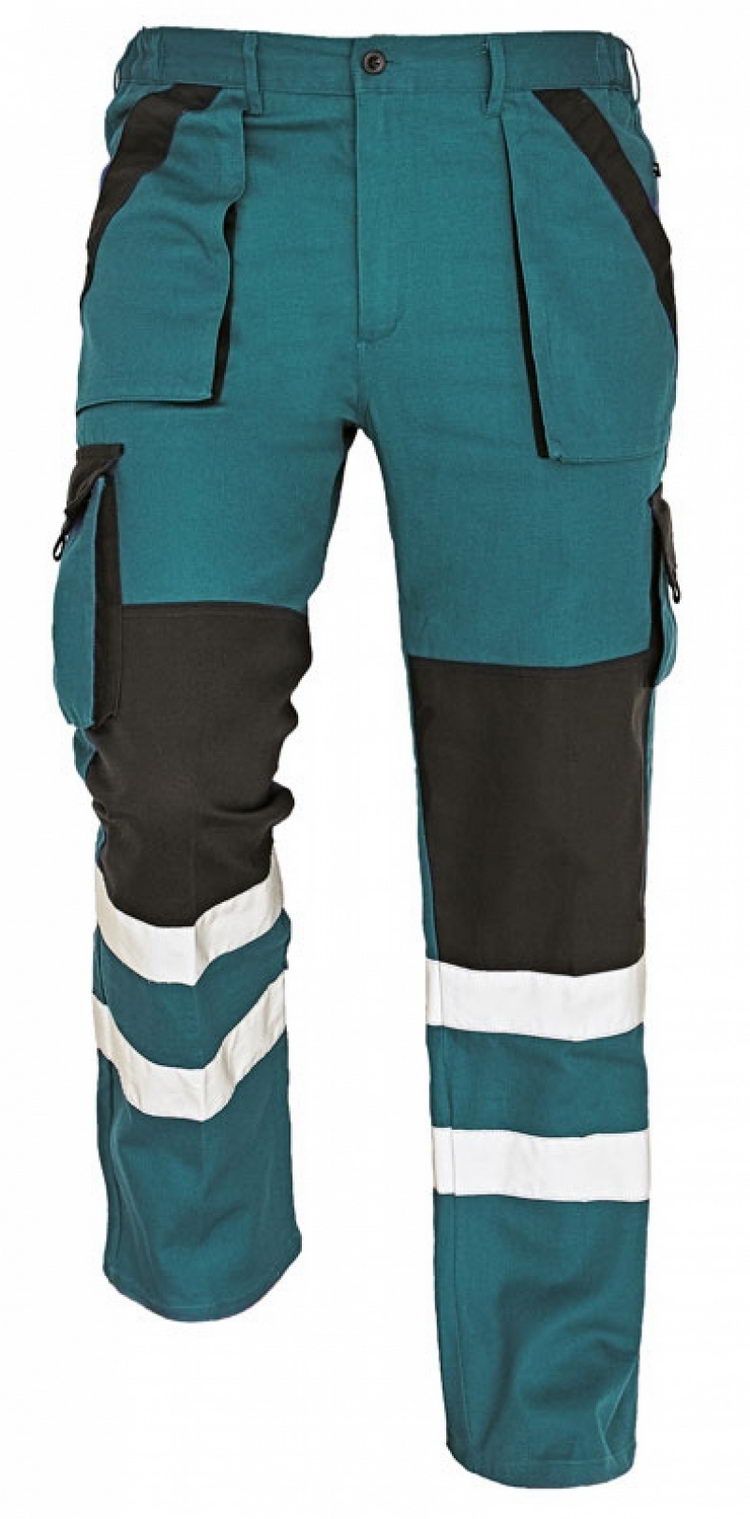 pánské pracovní kalhoty s elastickým pasem; 2 přední kapsy, 1 stehenní kapsa, 2 zadní kapsy; reflexní pruhy na spodní části nohavic; zesílená oblast kolen; nastavitelná délka nohavic.