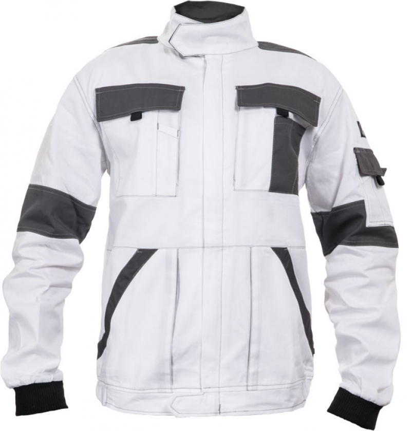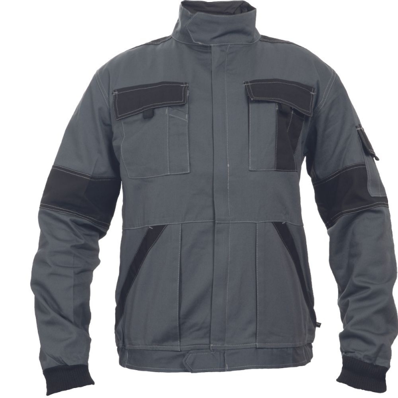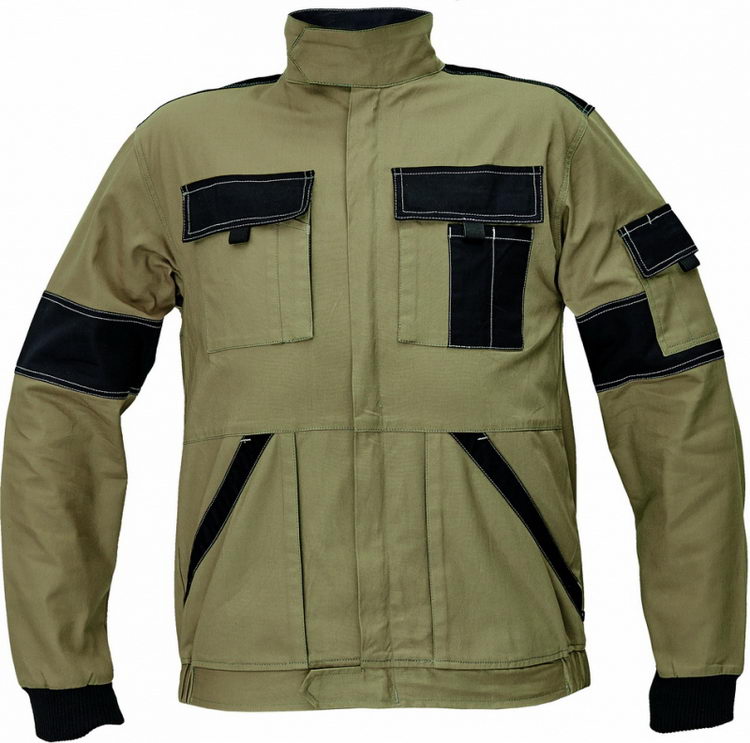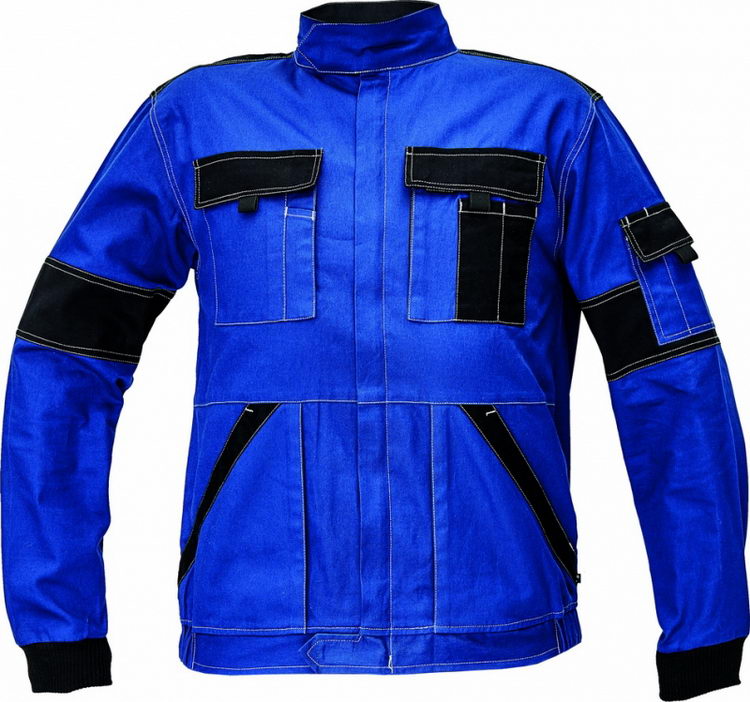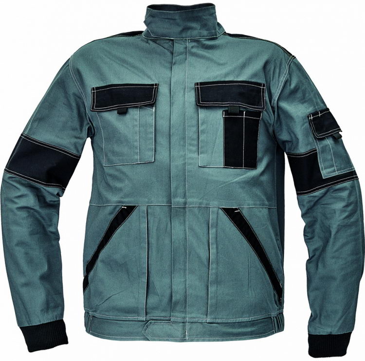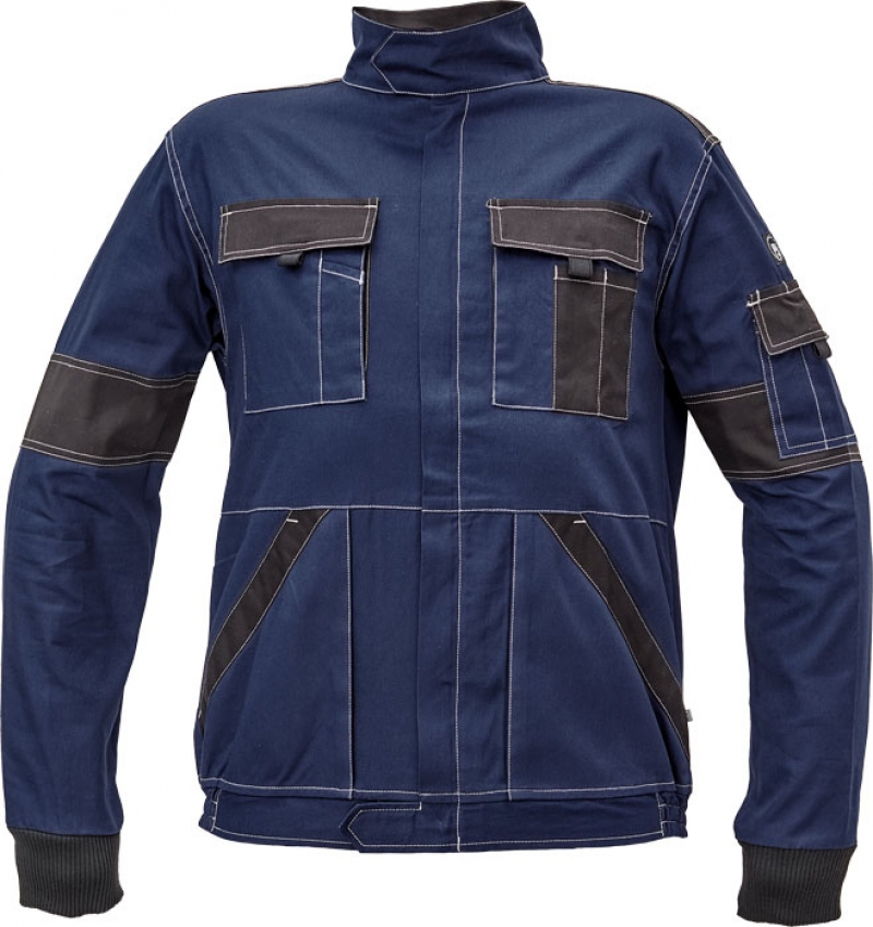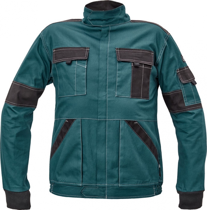 pánská lehká pracovní bunda se zapínáním na zip krytým légou; 2 přední kapsy, 2 náprsní kapsy s klopou; 1 malá kapsa na levém rukávu; zesílení namáhaných míst loktů a ramen; pružné manžety rukávů a spodní obvod v pase.