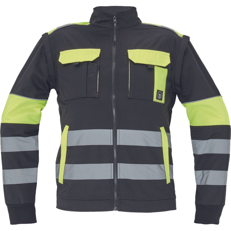 pánská reflexní pracovní bunda se zapínáním na zip; odepínatelné rukávy; 2 přední kapsy, 2 náprsní kapsy; zesílení namáhaných míst ramen a loktů; dvojice našitých 5 cm reflexních pruhů přes spodní obvod pasu a rukávů; 2 menší pruhy přes ramena; reflexní paspulky lemující zesílené části rukávů a ramen; pružné náplety manžet rukávů a elastický spodní obvod pasu.