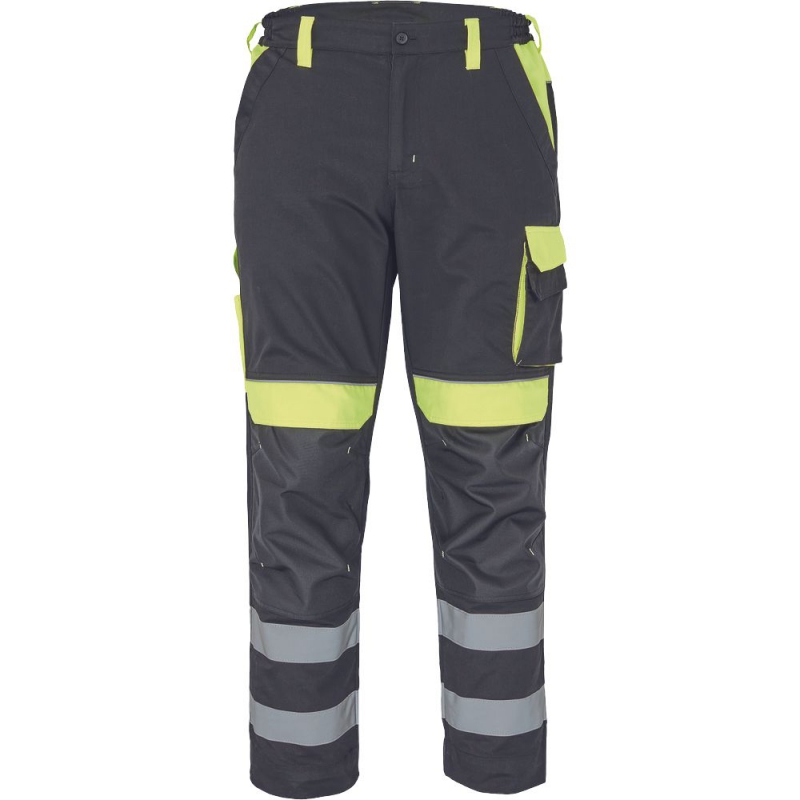pánské reflexní pracovní kalhoty s elastickým pasem; 2 přední kapsy, 1 levá zdvojená stehenní kapsa; 2 zadní kapsy, 2 menší zadní kapsičky na pravém stehnu; dvojice našitých 5 cm reflexních pruhů na spodní části nohavic, reflexní paspulky; Oxford 600D zesílení kolen s možností horního vkládání nákoleníků; možnost prodloužení nohavic.