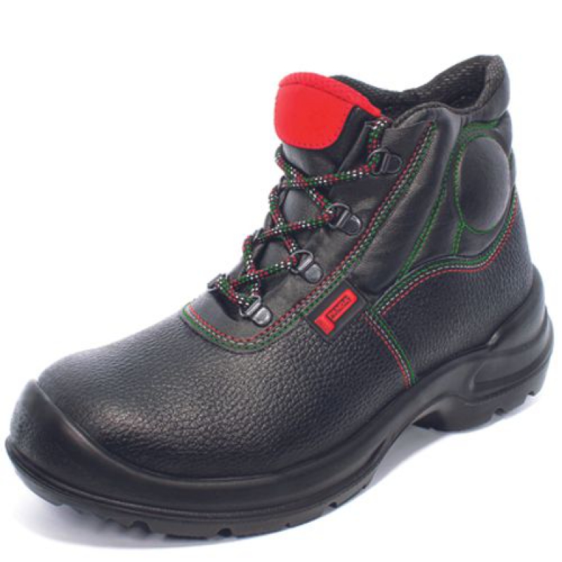 Bezpečnostní kotníková obuv s kovovou tužinkou i stélkou odolnou propíchnutí, antistatickou a protiskluzovou PU / PU podešví odolnou pohonným hmotám, absorpcí energie v patě a svrškem z prodyšné kůže.