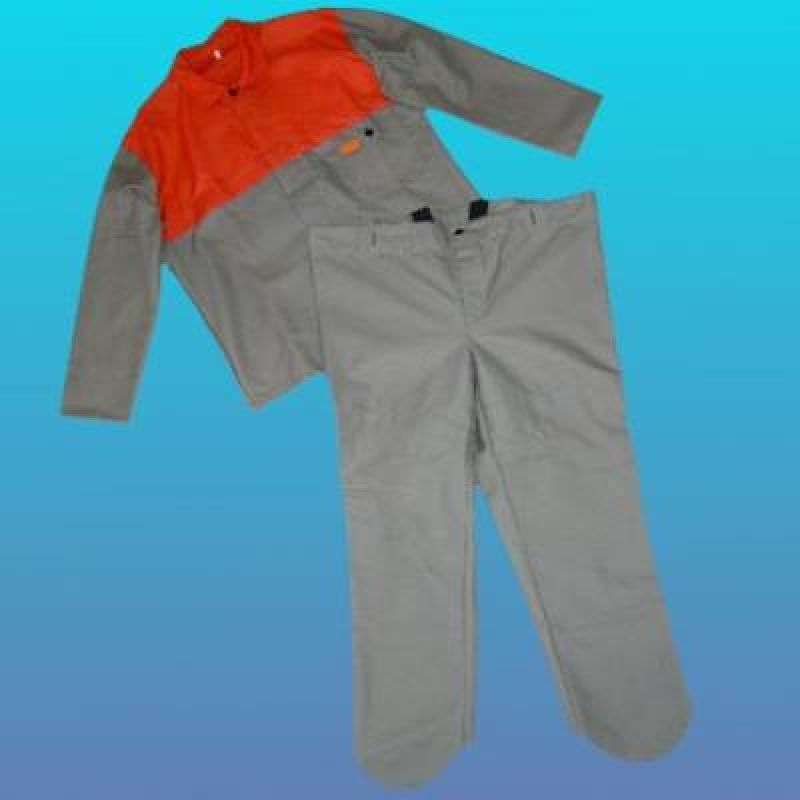 Svářečský Pracovní oděv z nehořlavé textilie oranžovo šedé barvy, kalhoty do pasu mají šle.